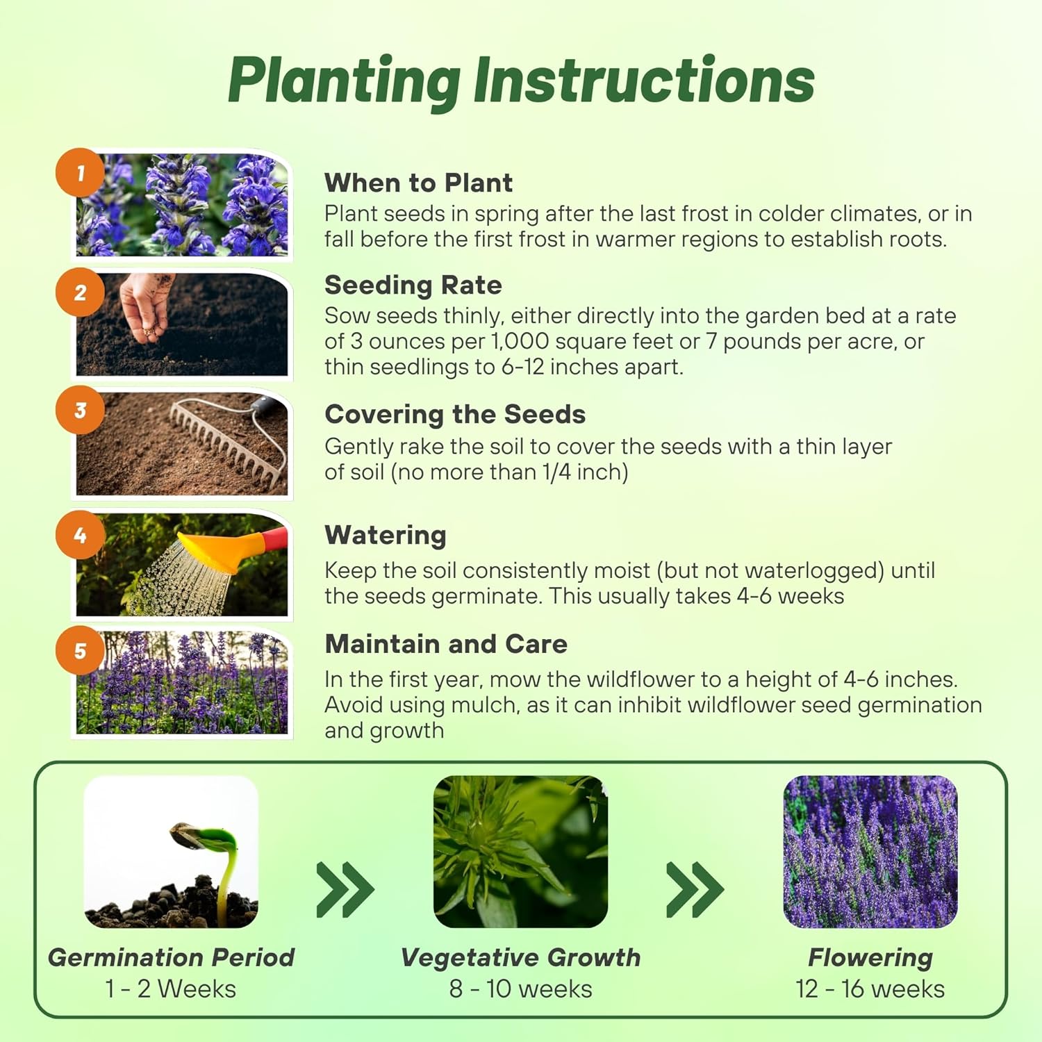 - VERSATILE COVERAGE FOR LANDSCAPING PROJECTS: With a sowing rate of 3 ounces per 1,000 square feet or 7 pounds per acre, our Blue Sage plant provide expansive coverage, perfect for creating large wildflower meadows, colorful borders, or textured open spaces. This versatile, easy-to-grow option from Outsidepride seed brings rich blue tones to any scale of landscaping project.