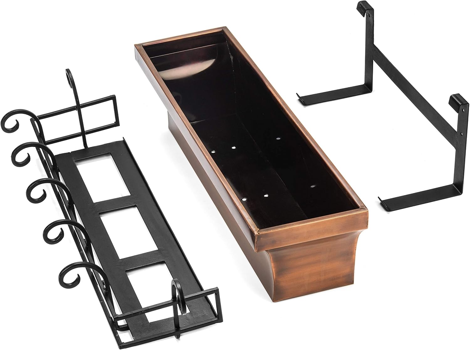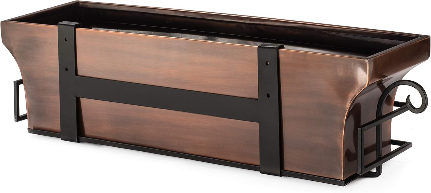 - Sturdy window boxes for the home โ The rich color of this flared window box adds an extra layer of depth to any outdoor decor. The antique copper finish is perfectly paired with the black powder coat of the frame, and is accentuated by the scroll work on the frame. The wide mouth at the top of the window flower box allows your flowers to breathe and grow throughout the box. The sturdy but lightweight design allows the easy to remove brackets to functionally support the window box.