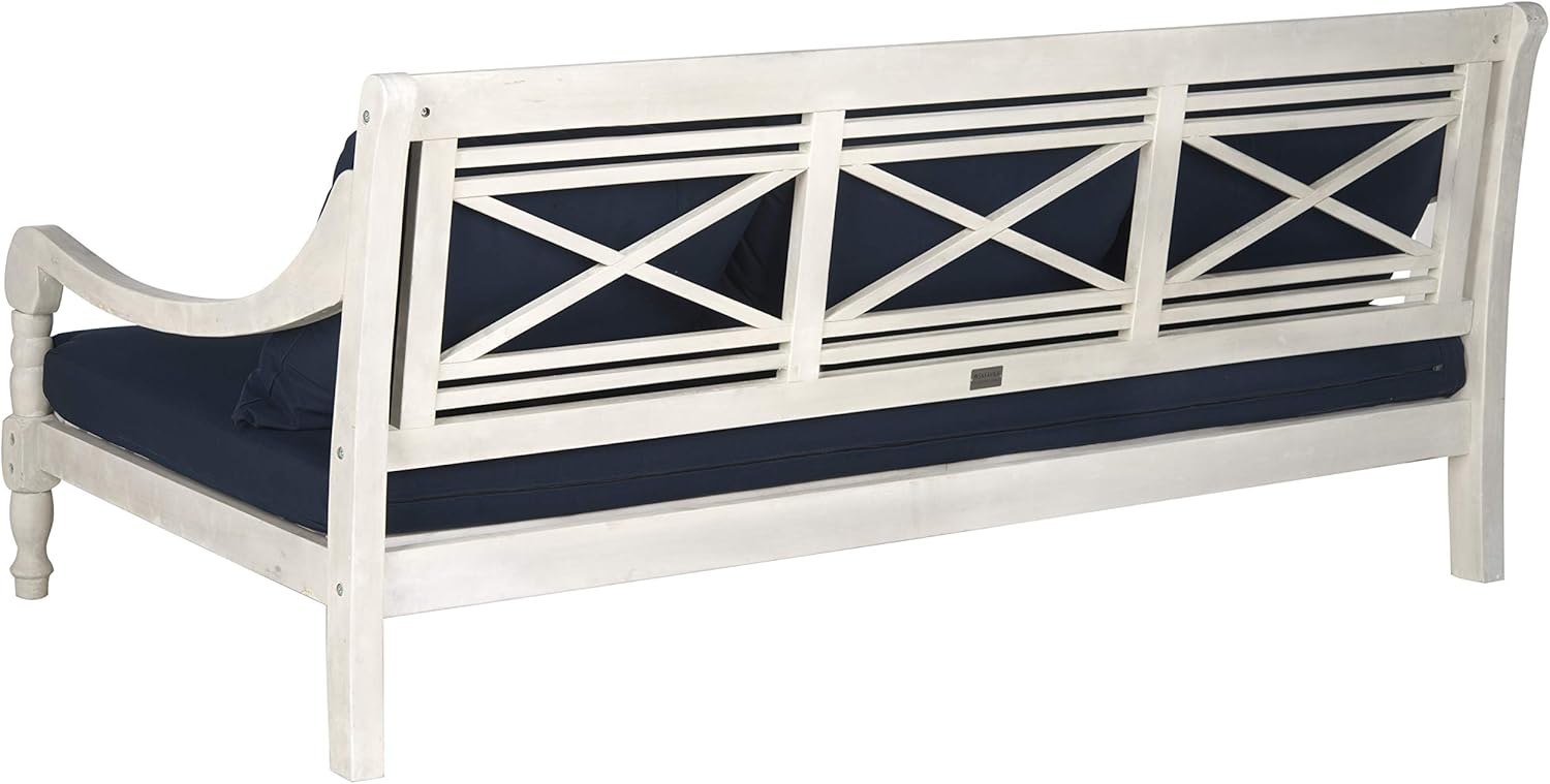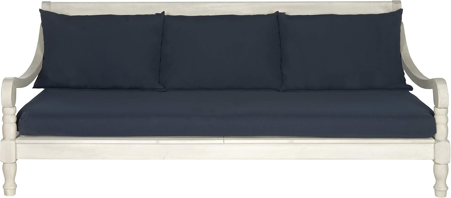 - The navy upholstery and antique white finish of this day bed will add the perfect accent to any outdoor space