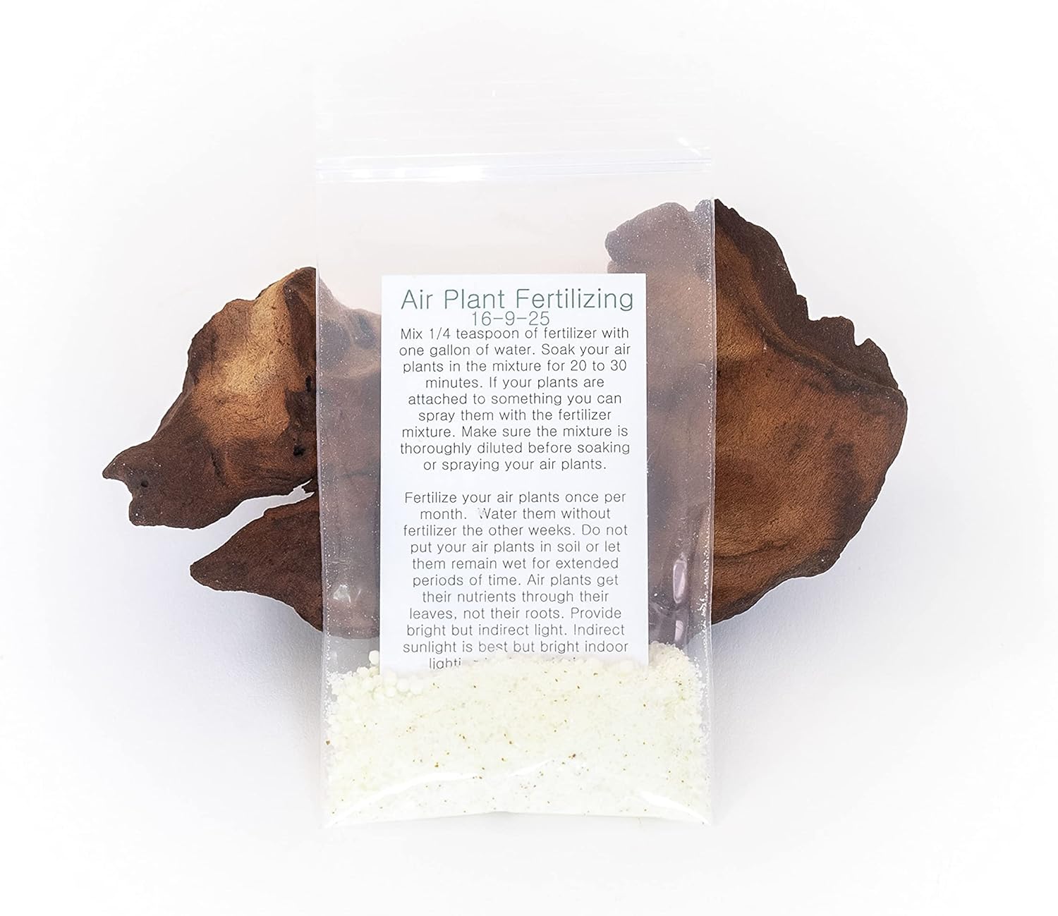 - ABOUT FERTILIZER: Just add 1/4 teaspoon to a gallon of water and soak your air plants in the diluted mixture for 20 to 40 minutes once per month. The package comes with instructions and a one year supply of fertilizer. You may also add the well-diluted fertilizer mixture to a spray bottle and use it to mist your plants. Instructions are included with every packet.