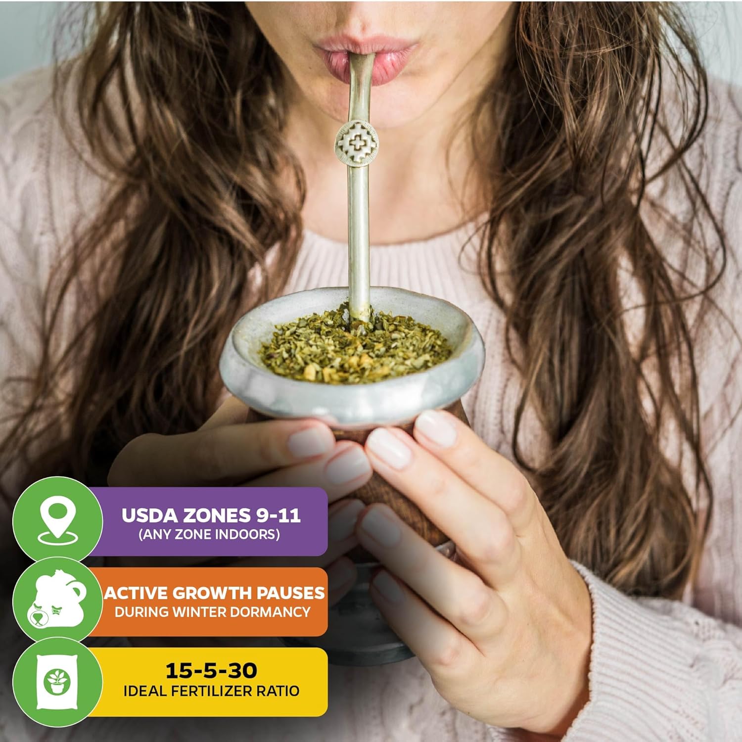 - ENERGIZING DRINK: Harvest the leaves of your Yerba mate plant to create a popular South American energizing drink called mate, akin to black tea or coffee, enjoyed for its stimulating effects.