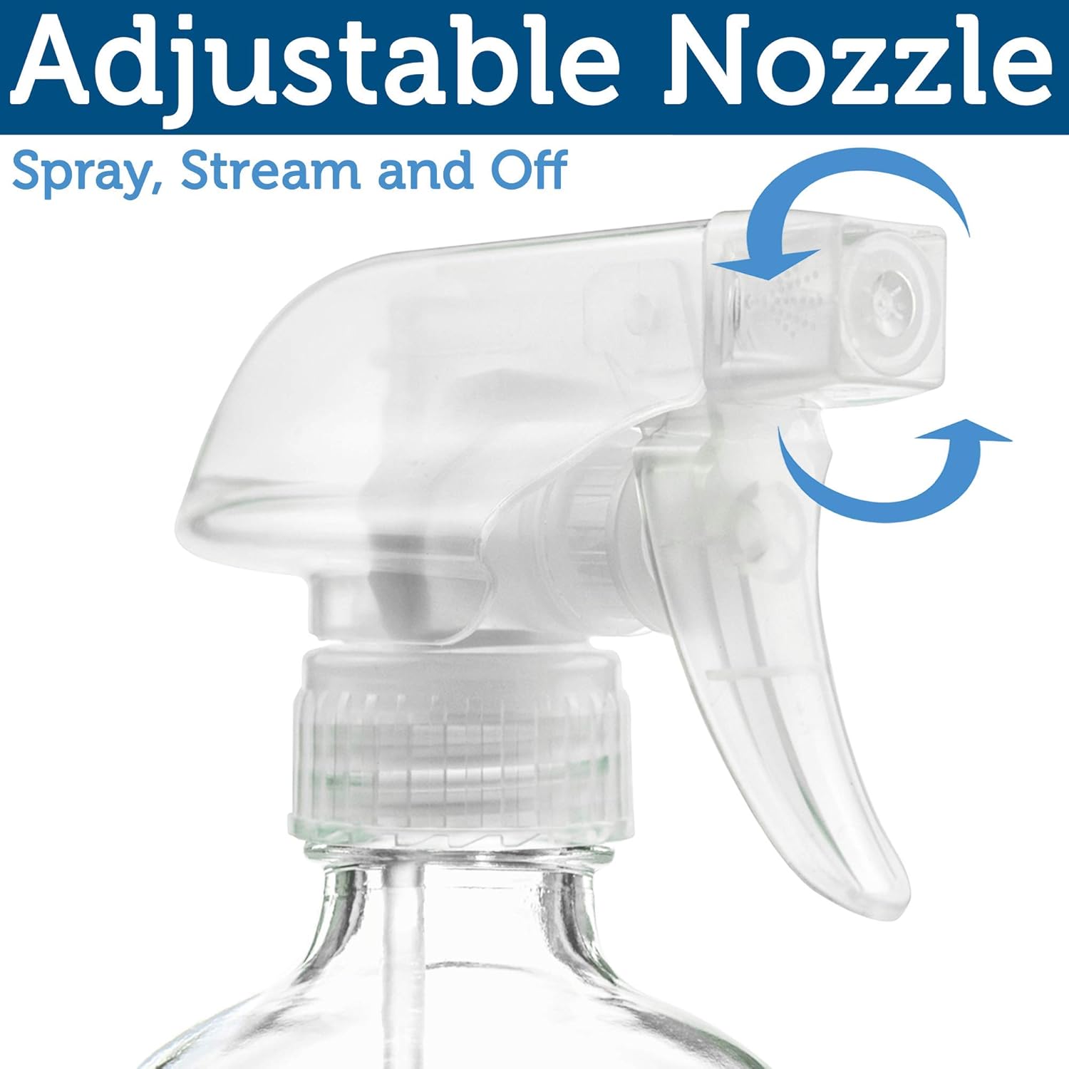 - Large 16 ounce bottle with an easy to pull clear nozzle that can be set to either a fine mist or a strong stream. Includes 2 phenolic caps and 4 3"x3" labels.