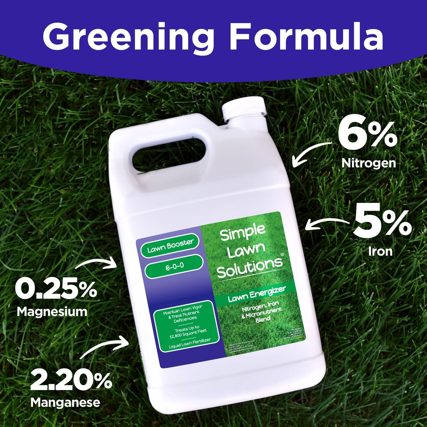 - Lawn Energizer 6-0-0 Contains 6% Nitrogen: Nitrogen Is A Major Component Of Chlorophyll Where Lawns Get Their Green Coloring. Nitrogen Encourages Growth For The Development Of A Dense Attractive Lawn