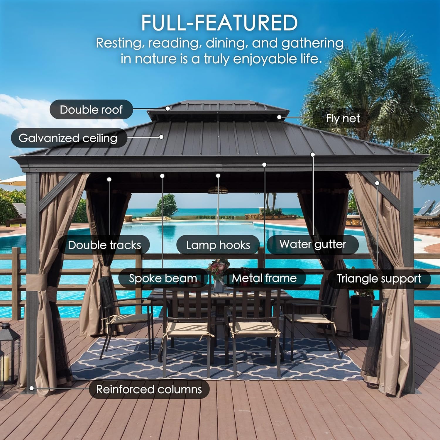 - ✅Double Roof Design- The innovative double-top design of the Alexander gazebo not only enhances its aesthetic appeal but also promotes optimal breathability and exceptional air circulation, creating a pleasant environment, helping withstand strong wind.