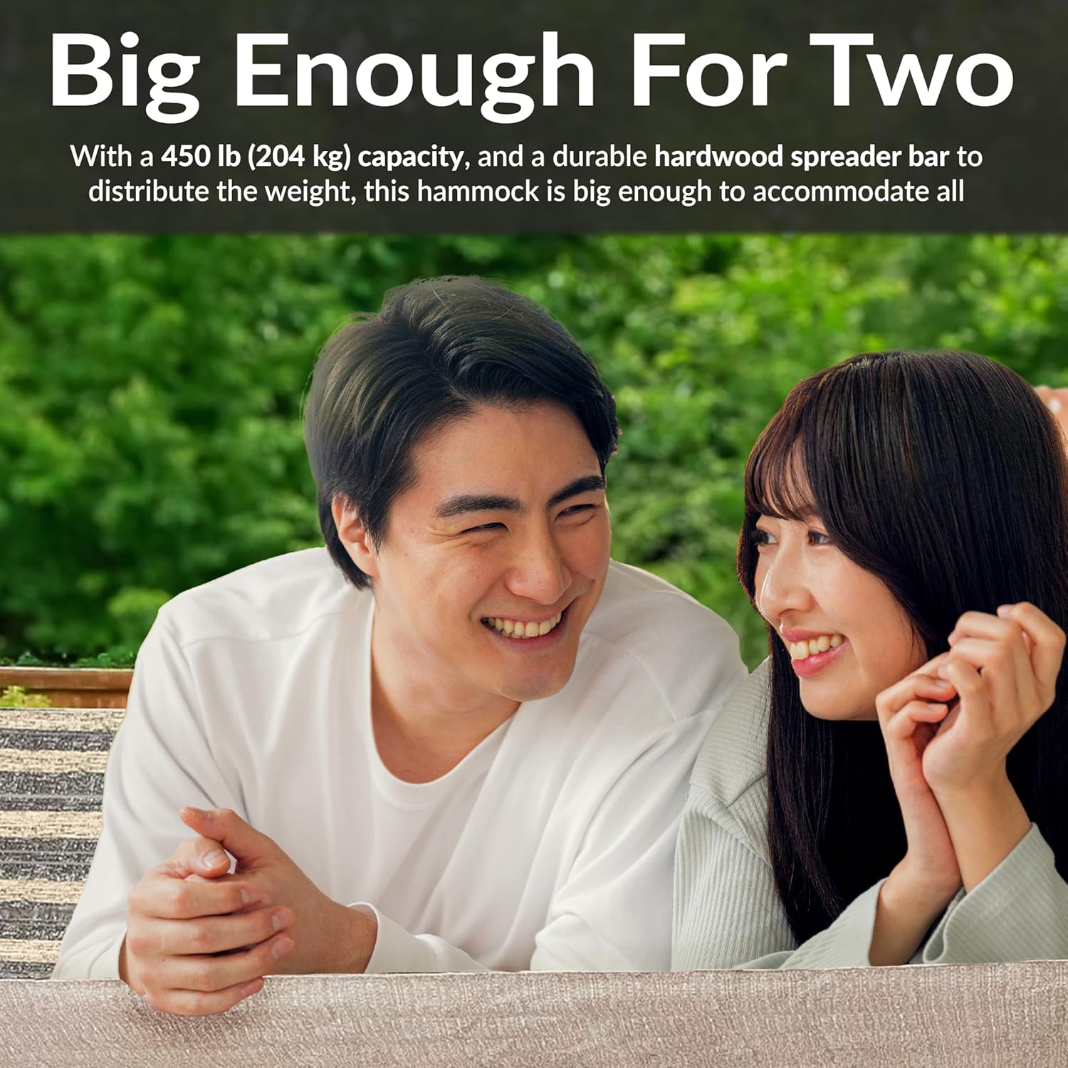 - EXTRA SPACE FOR TWO PEOPLE: This spreader bar hammock is 125.5" W from loop to loop. The bed size is 74" W x 55" D. It weighs 10 lbs and has a weight capacity of 450 lbs. This patio hammock provides enough space for two adults to relax comfortably side by side.