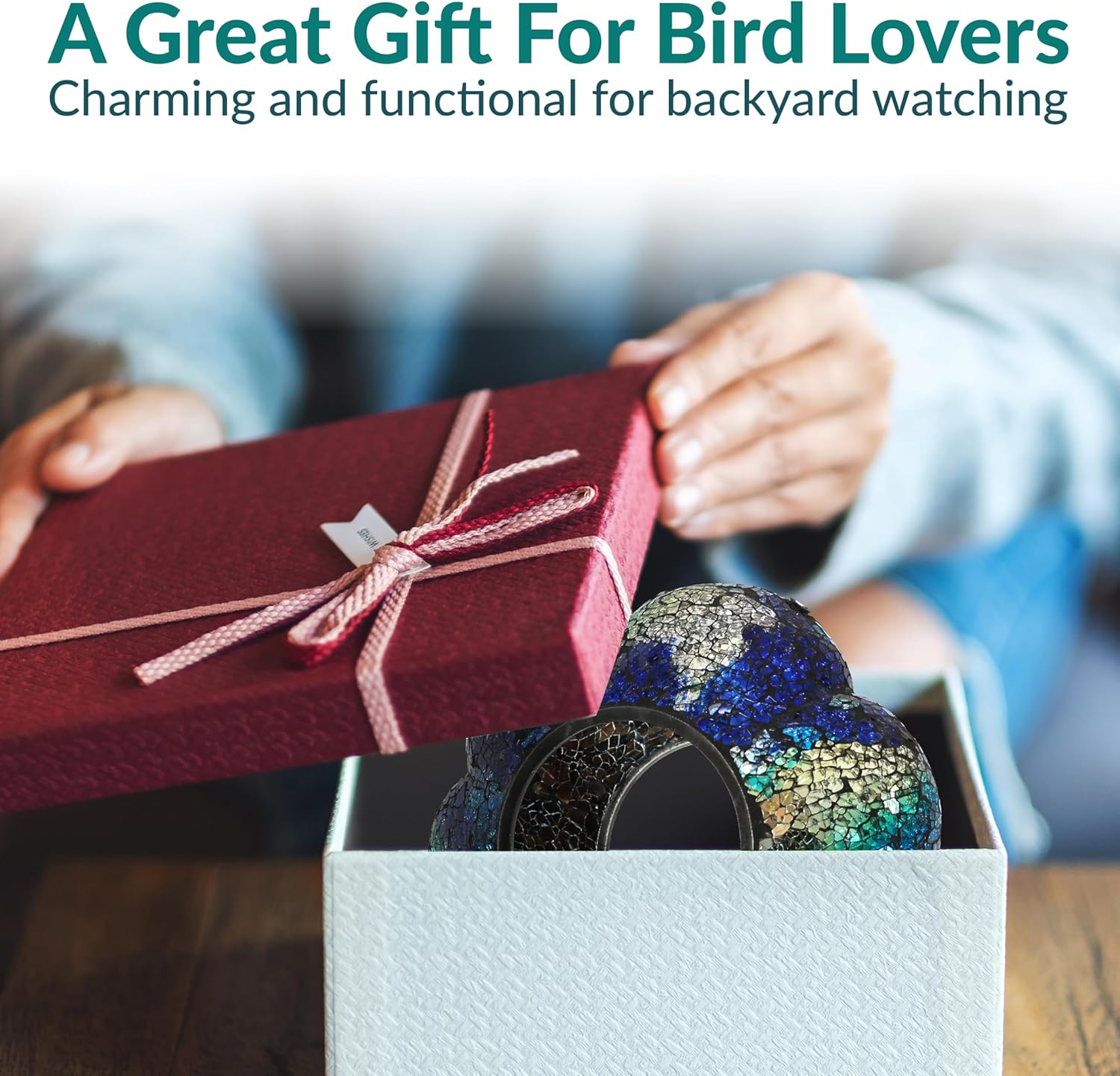 - ATTRACT BIRDS TO THE YARD: The backyard bird feeder is made of glass in the shape of flower. It features a beautiful deep blue color with speckles of turquoise and yellow.