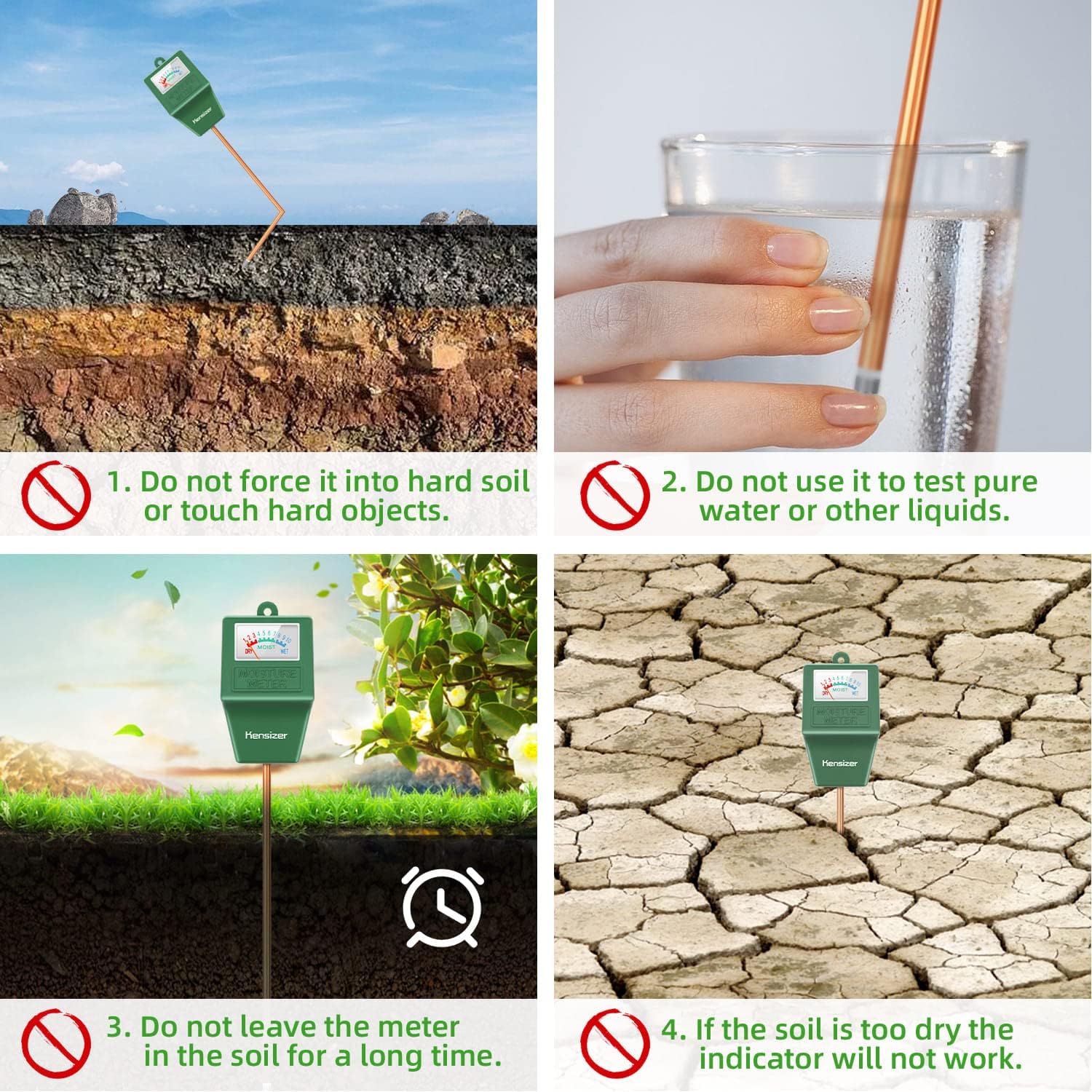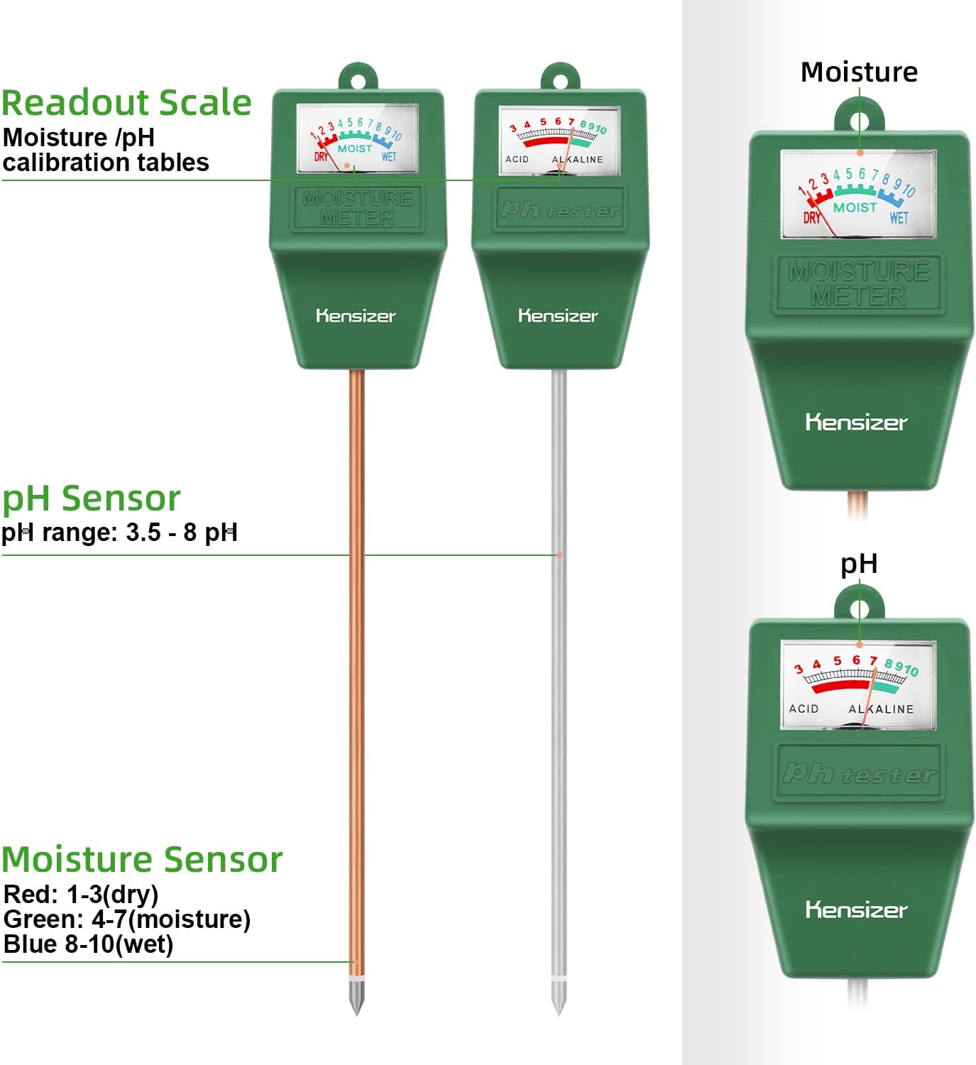 - Single Probe Detection -- Make it easier to insert into the soil and lessen damage to the probe and get you more accurate data quickly. If the soil is too dry the probe will not move, water it before testing. Otherwise, it is easy to damge the probe causes the product not work. And insert the probe into the soil about 2-4 inches.