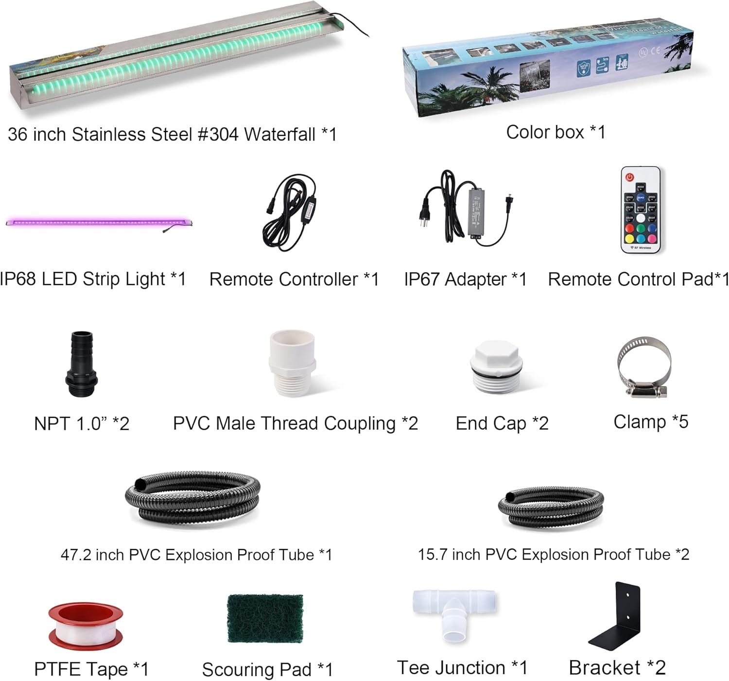 - Great Decoration - LED-lighted waterfall spillway makes your garden elegant, fashionable, and beautiful. The color changed as you like with the gentle sound of water running make your patio more special at night. It comes with a 304 stainless steel spillway, IP68 LED strip, IP67 adaptor, RF remote, supply cord, and 1.2โ female PVC pipe adapter
