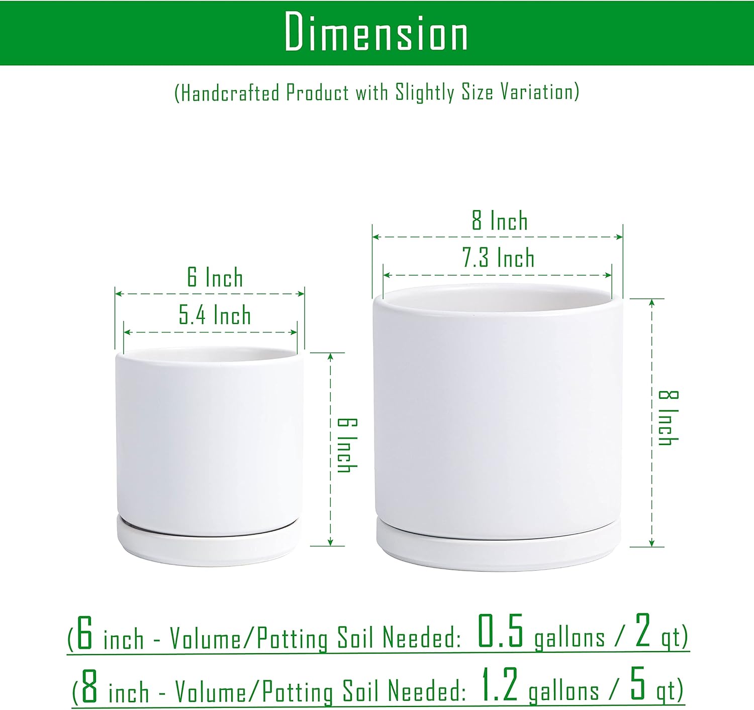 - Medium Set of 2 Plant Pots Dimensions: 6" Diameter (5.4" Inner Diameter) * 6" Height; 8" Diameter (7.3" Inner Diameter) * 8" Height. Potting Soil Needed: 6-inch 2 qt; 8-inch 5 qt.