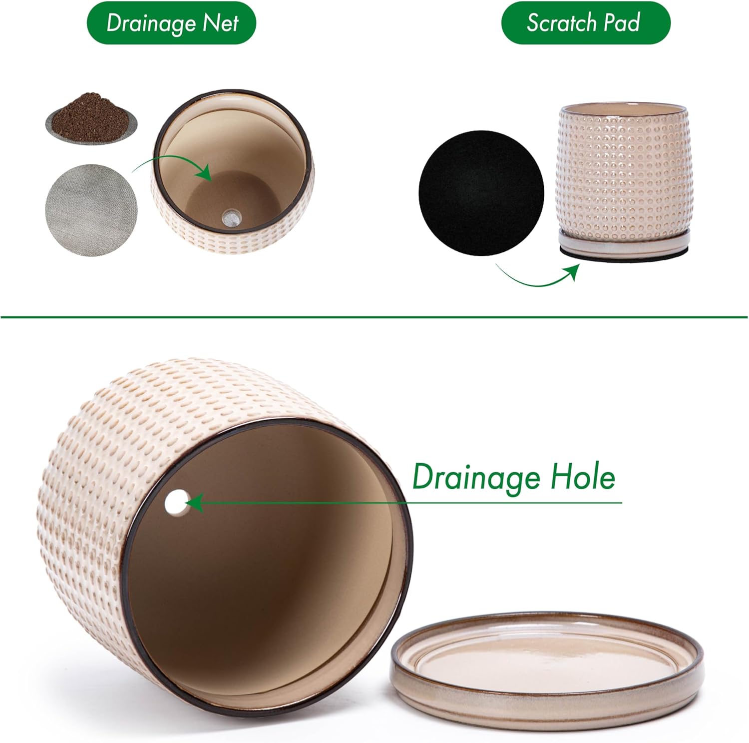 - >> Drainage Net and Pad - A drainage mesh net is also included to prevent soil from falling off the pot. Another protective pad is included to protect tabletop wood surface from scratches.