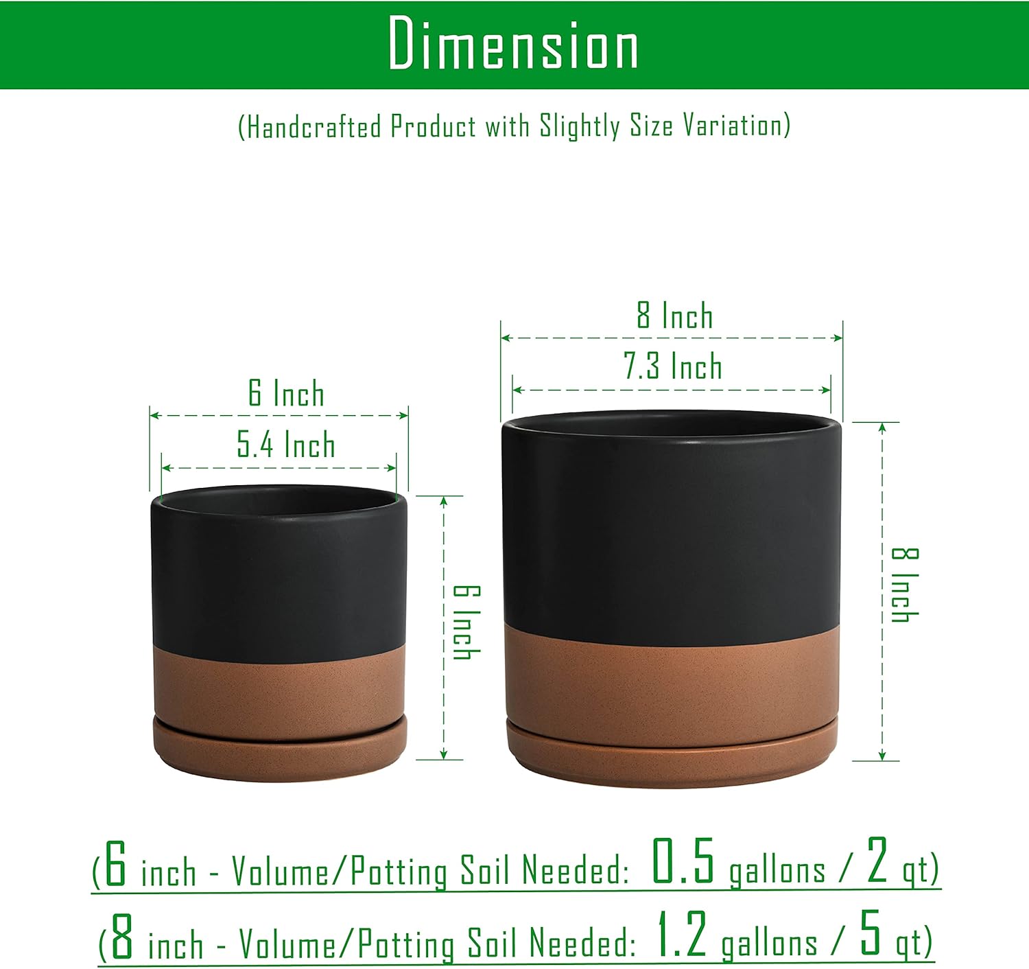 - Medium Set of 2 Plant Pots Dimensions: 6" Diameter (5.4" Inner Diameter) * 6" Height; 8" Diameter (7.3" Inner Diameter) * 8" Height. Potting Soil Needed: 6-inch 2 qt; 8-inch 5 qt.
