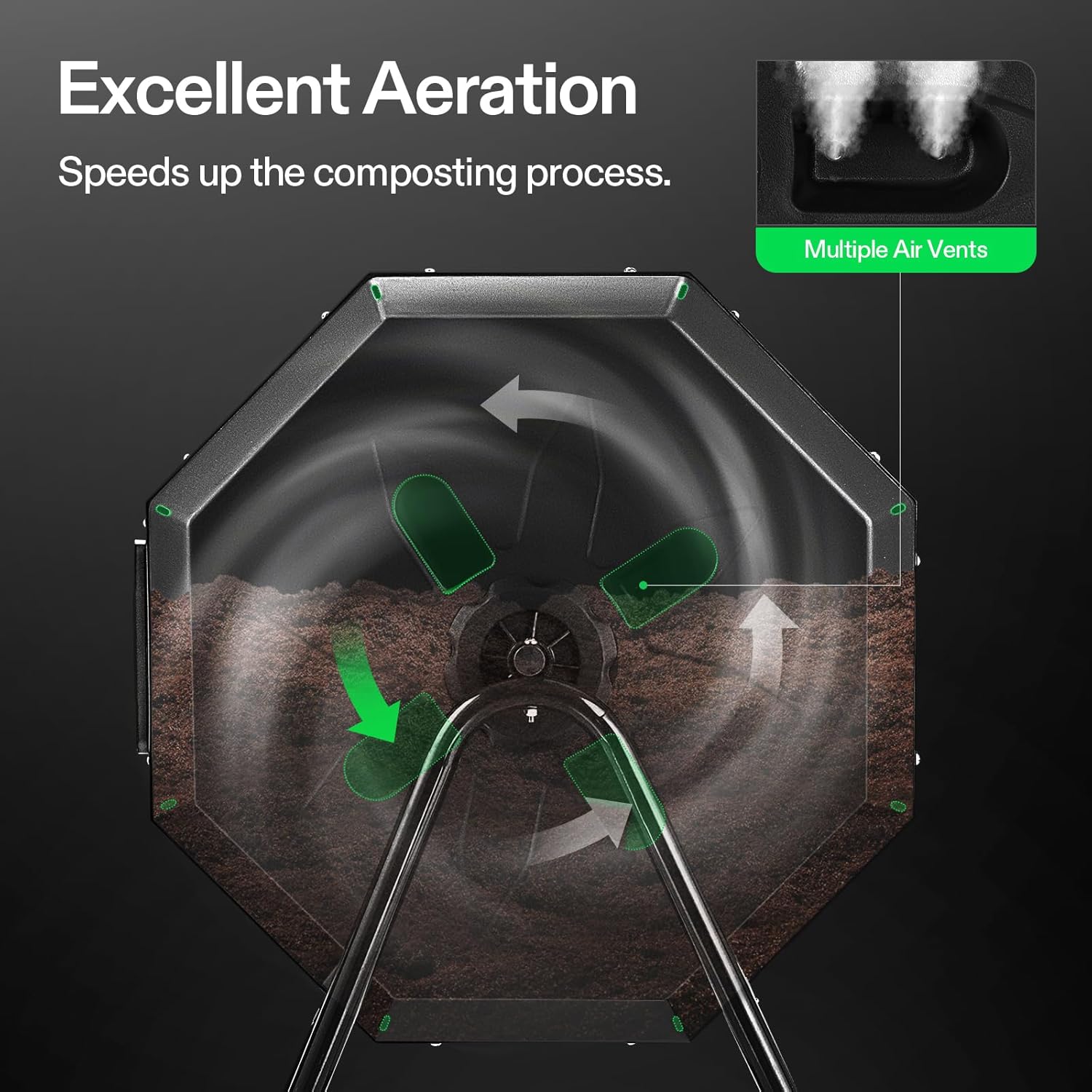 - 360โฐ Tumbling Design: The rotating design prevents you from digging or mixing the pile by hand; And the deep fins on eight panels make it easier to turn the compost bin