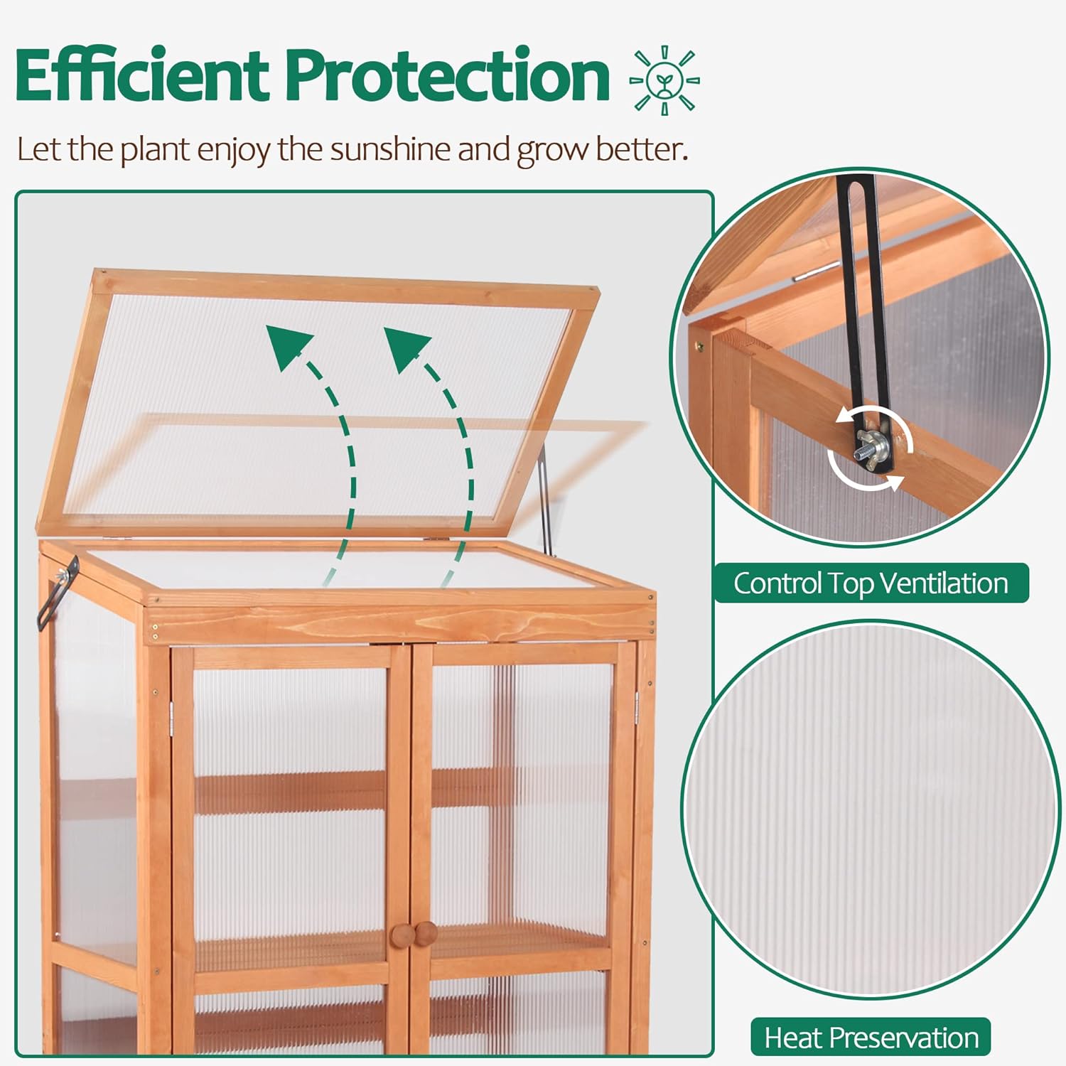 - Efficient Protection: Garden greenhouse used transparent polycarbonate panels, which have maximum light transmission function while retaining heat for early seed sprouting and for protecting plants late in the season, your plants could enjoy the sun and grow healthily