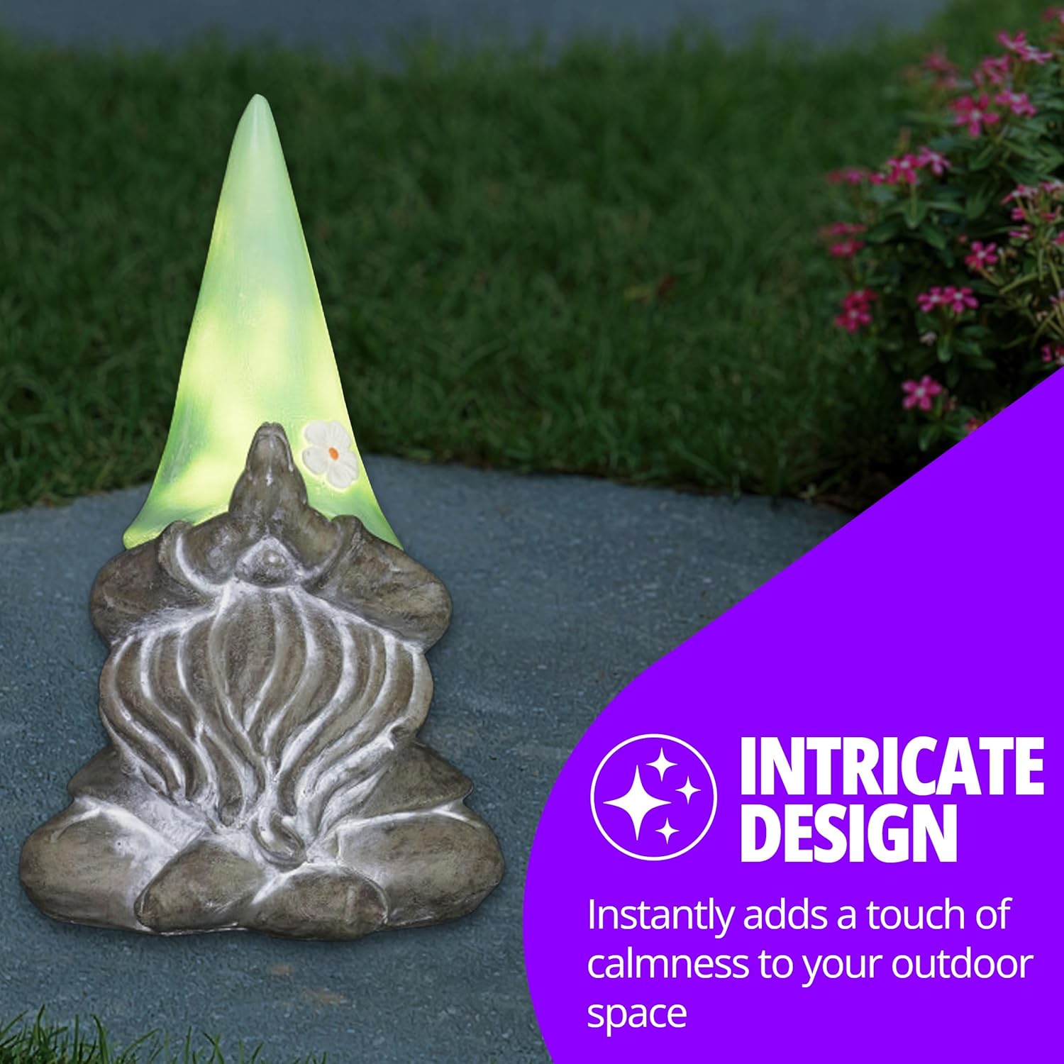 - MEDITATION GARDEN GNOME STATUE: Say (g) namaste and add a touch of whimsical and spiritual charm to your home garden decor with the Exhart Meditating Garden Gnome Statue; crafted with durable resin and meticulously hand painted, this enchanting "gnamaste" garden gnome statue sits in a cross-legged lotus pose and features an adorable LED mint colored flower hat, providing soothing accent lighting to your outside garden, front porch, patio, lawn, or yard