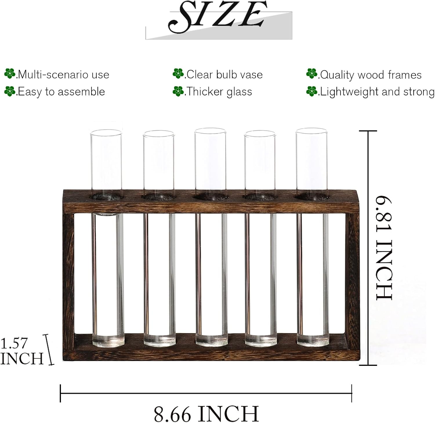 - ❥Size:The wooden stand size:4.92"H x 8.66"W x1.57"D. Test tube size:0.9"W x6.57"H. Package included : the wood stand and vase, 6 x Test Tube Vase ; 1 x Wooden Stand ; 1 x Tube Brush ;1 pack accessories; NOT PLANT INCLUDE