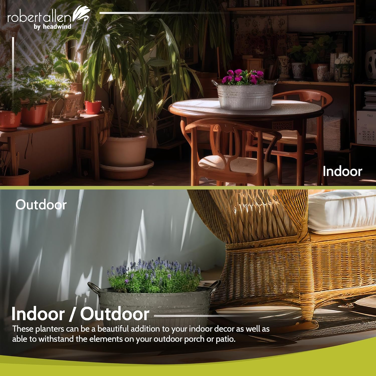 - STYLISH & VERSATILE DESIGN – From the Robert Allen Galvanized Collection, these metal planters are available in a variety of styles including round with rope, tub design, oval design, and simple round. Each design adds visual interest and coordinates easily with a range of home or garden decor.