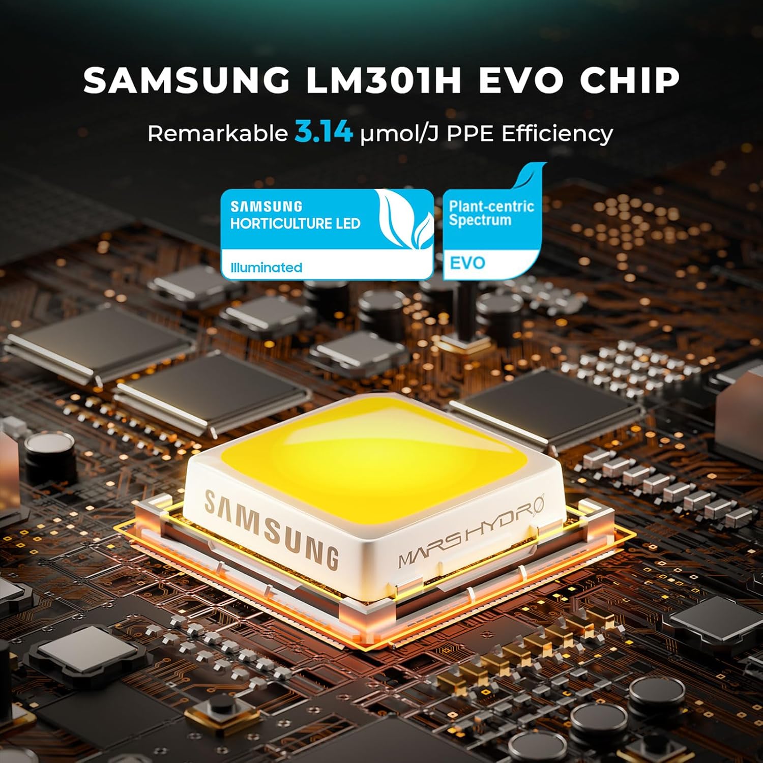 - Supreme Efficiency: The light is equipped with Samsung LM301H EVO LEDs , which are rated at 745.9μmol/m²/s, have a PPE of 3.14 µmol/J per diode, and provides an overall PPE of 2.95 μmol/j. It is a high efficacy and reliability LED package designed for Commercial Planting.
