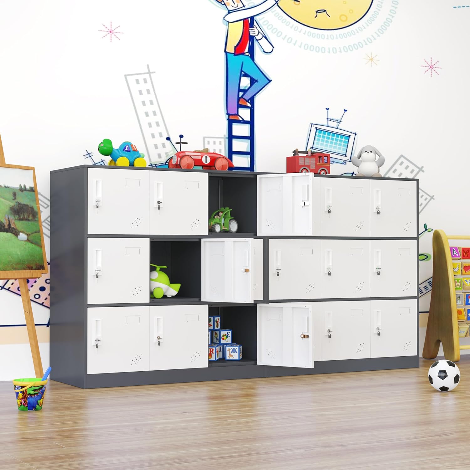 - MULTIFUNCTIONAL AND MULTI-PURPOSE: The gym locker cabinets are perfect for offices, homes, schools, banks, schools, factories, dormitories, employee lounges, gyms, public swimming pools, locker rooms and more. The metal locker storage cabinets are equipped with special locks with high security, 200 locks can't open each other, making the storage more secure.