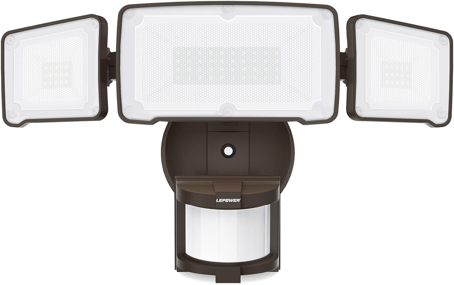 LEPOWER LED Security Light Motion Sensor Light Outdoor, 38W 4200LM Motion Security Light, 5500K, IP65 Waterproof, 3 Head Motion Detected Flood Light for Garage, Yard, Porch (Not Solar Powered, Brown)