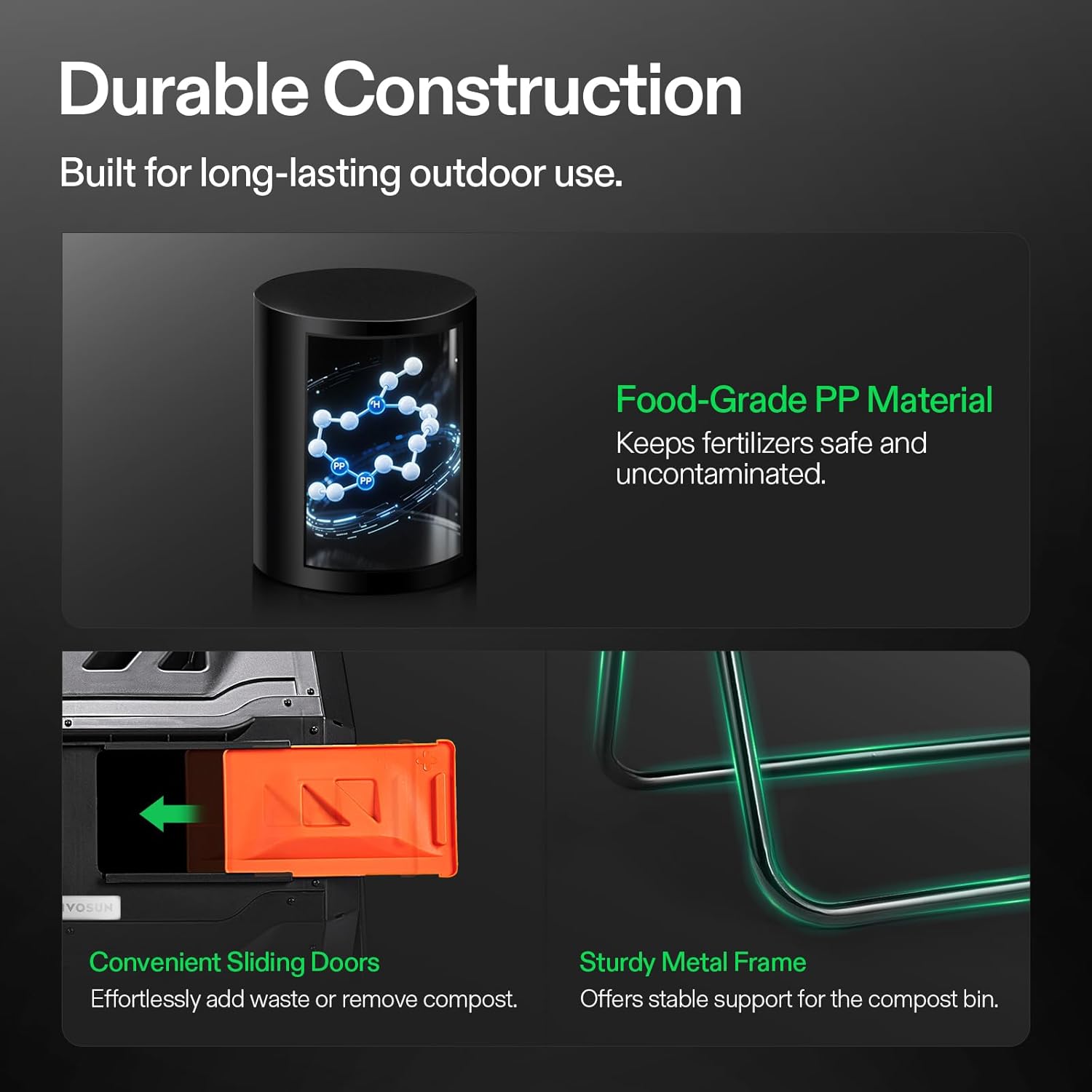 - Twin chambers: Two separate chambers allow one side to finish composting while leaving the other side available to add fresh wastes; Constant alternation of the two sides will create an uninterrupted stream of nutritious compost