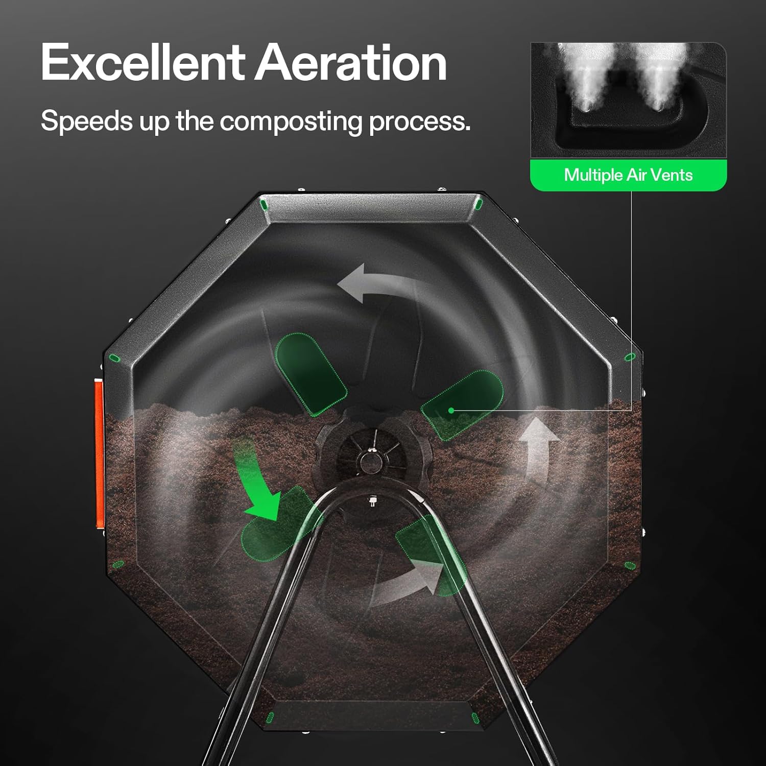 - 360โฐ Tumbling Design: The rotating design prevents you from digging or mixing the pile by hand; And the deep fins on eight panels make it easier to turn the compost bin