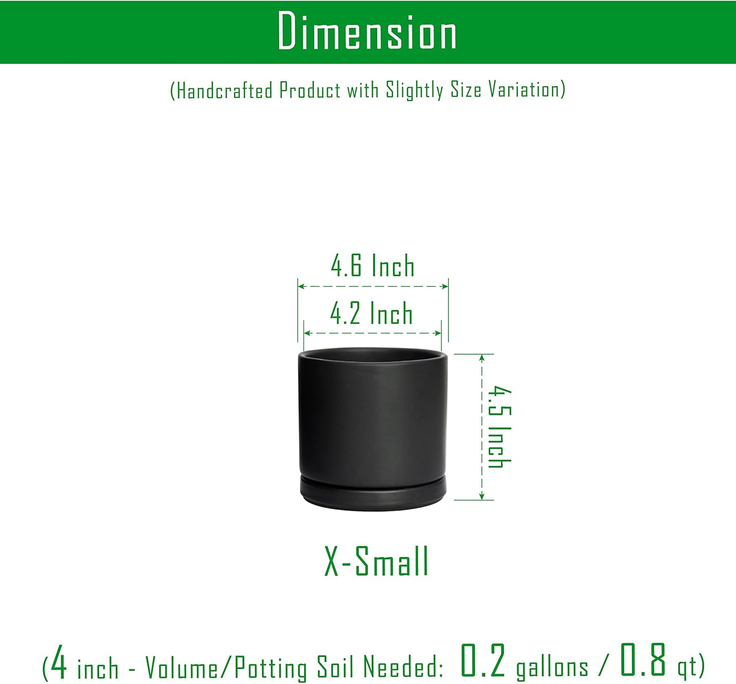 - X-Small 4.6 Inch Planter Pot: 4.6" Diameter x 4.5" H, black color. Potting Soil Needed: 0.2 gallons / 0.8 qt.