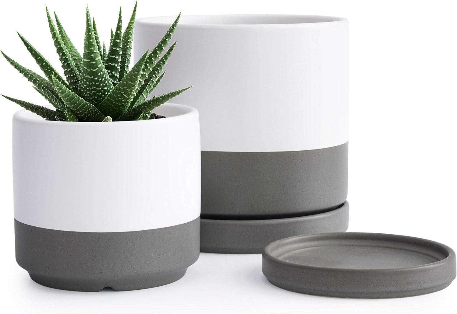 D'vine Dev 4.6 Inch & 6 Inch Ceramic Planter Pots for Plants with Drainage Hole and Saucer, Small Plant Pots Set, White/Speckled Grey, 94-G-S-6