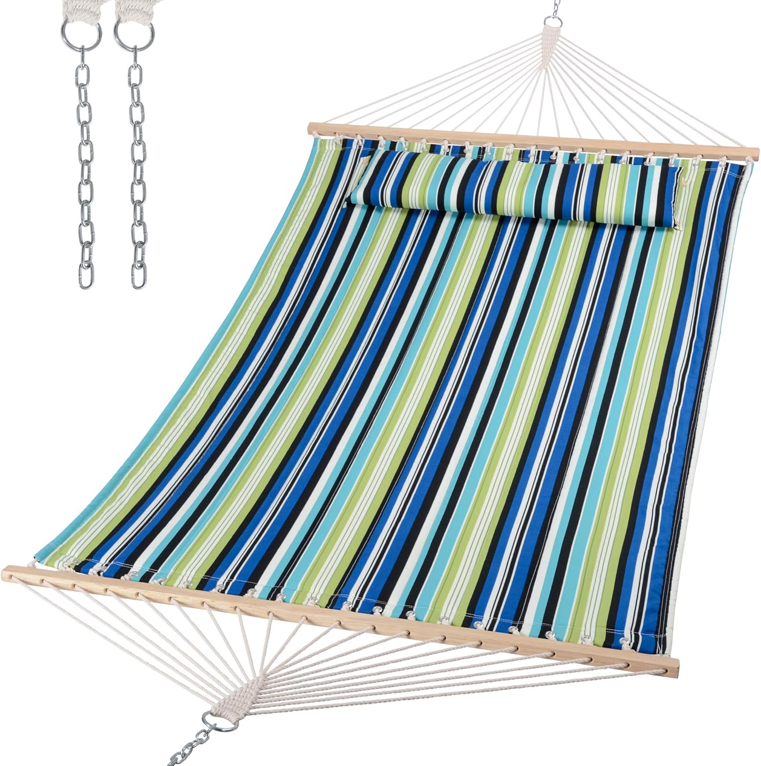 - Comfortable and Non-fading: Two-layer quilted polyester fabric with poly fiber filling which is cozier, best for camping and outdoor activities. Compared to other quilted hammocks, it will not fade after long-term usage. A polyethylene-stuffed head pillow offers superior comfort