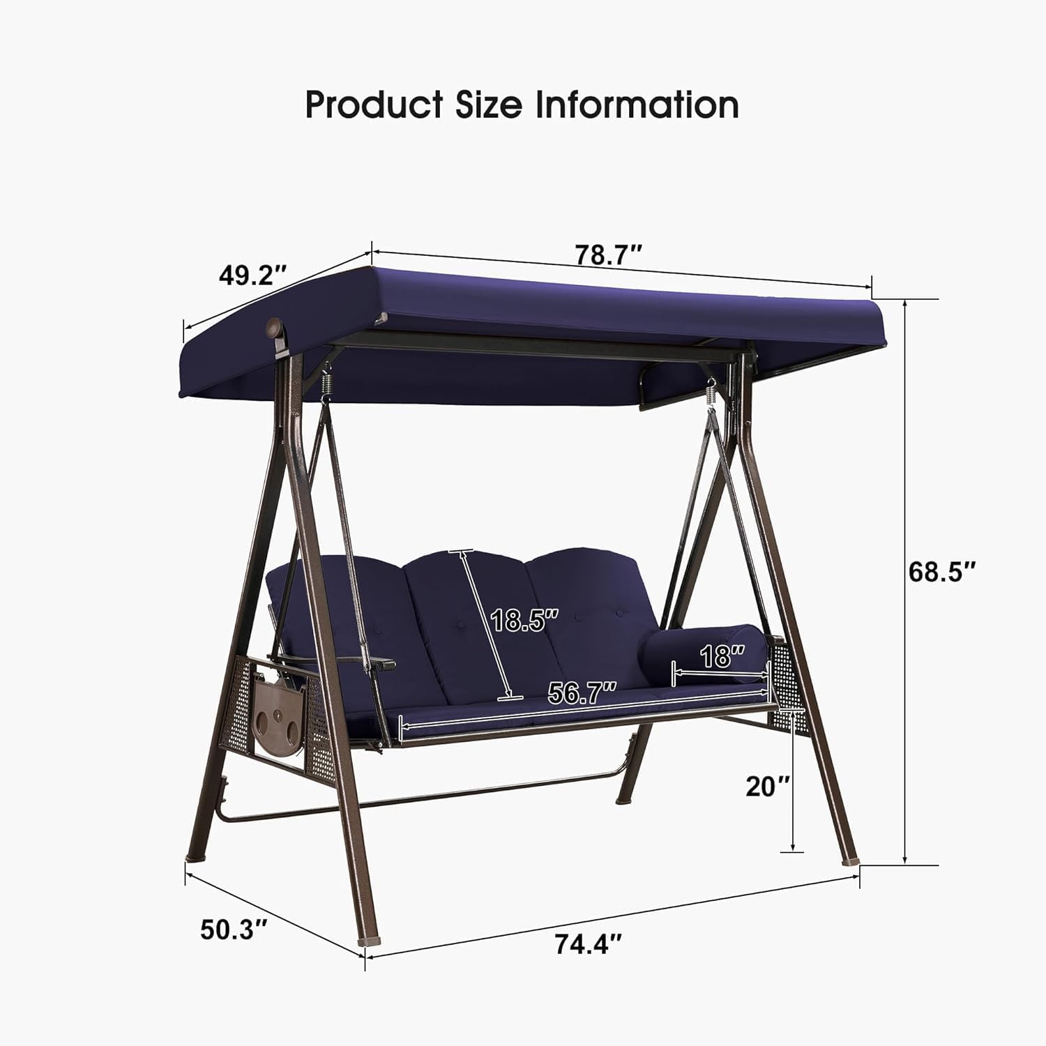 PURPLE LEAF 3-Seat Deluxe Outdoor Patio Porch Swing with Weather Resistant Steel Frame, Adjustable Tilt Canopy, Cushions and Pillow Included, Navy Blue