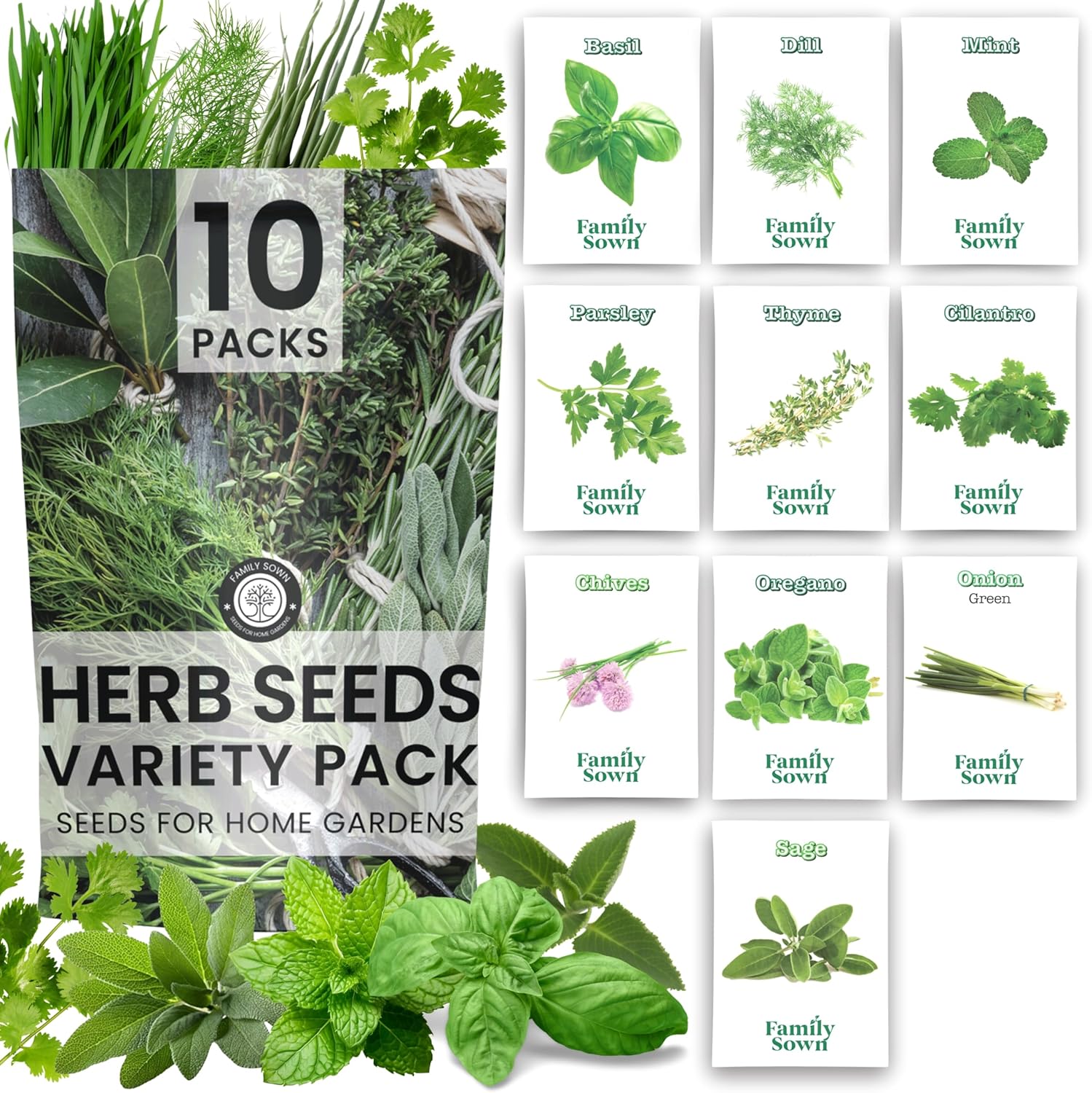 Herb Seeds | 10 Invidiual Packs | 2025 Season | Non-GMO | Mint, Parsley, Basil, Thyme & More! | for Planting Indoor & Outdoor | by Family Sown
