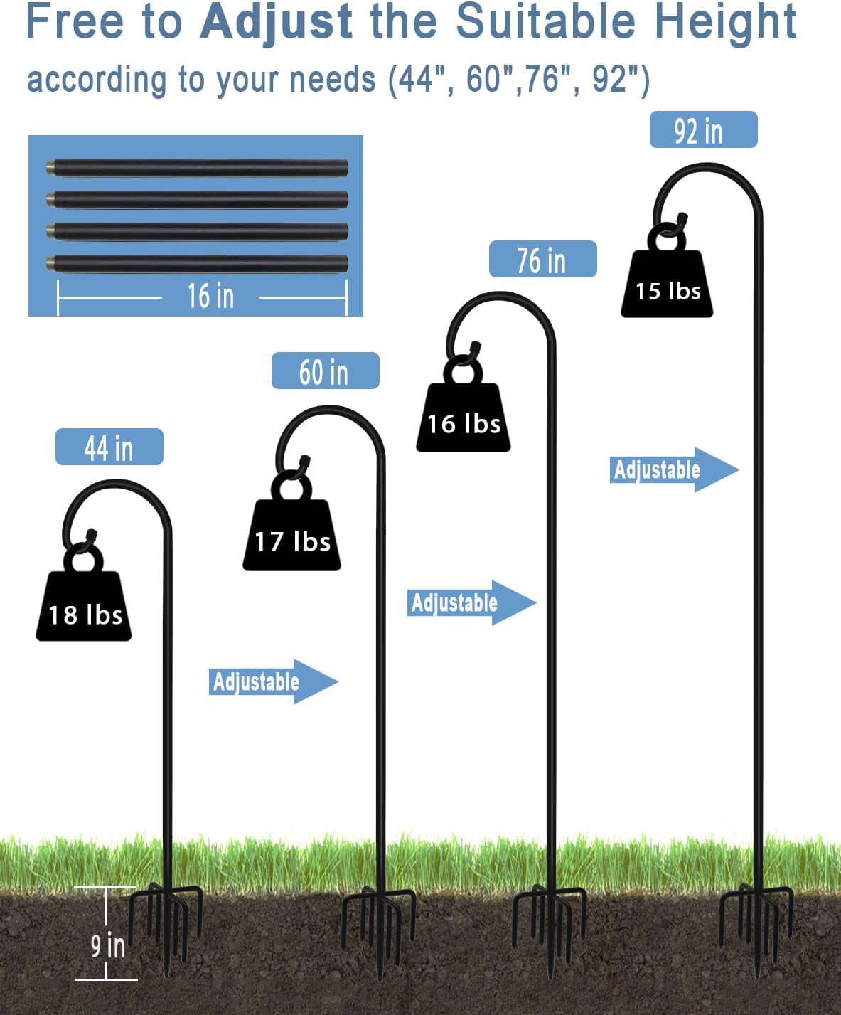 - Super Easy to Assemble & Use: The freestanding 92 inches shepherds hook is quite easy to install or remove down, it comes with 1 base prongs, 1 "S" hook and 4 high-quality steel pipes, each part can be screwed together quickly, no extra tools or accessories needed, just easily place it into the soil or sand with the points.