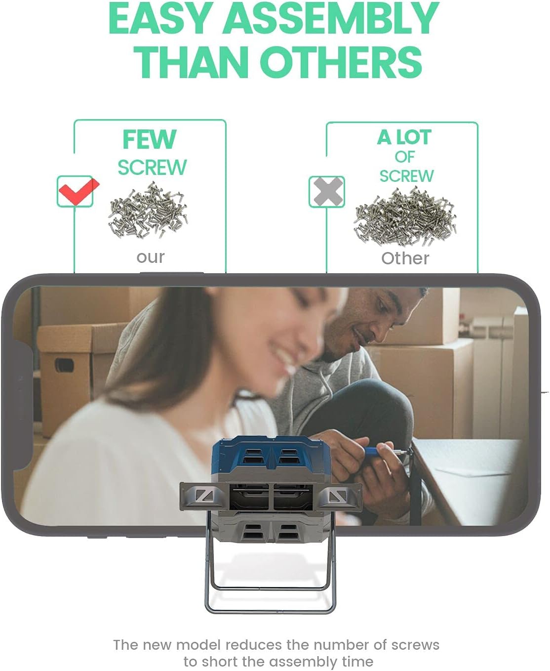 • Short Assembly Time - 2021 new version composter has reduced the screw Qty for easy assembly and modify middle panel to closely separate the two chamber.