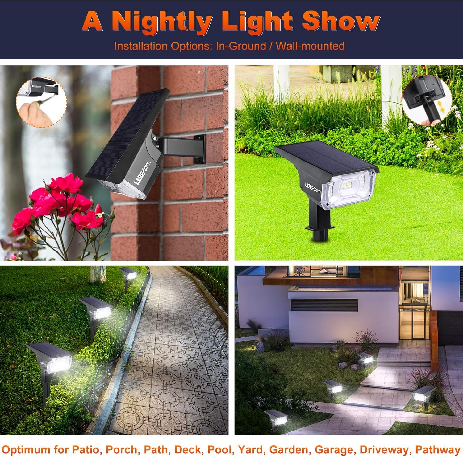 - 2 in 1 Function & 2 Installation Options: Easy to install. Stick into the ground with stakes & Mount on the wall with the screws included.The solar spot lights outdoor are greatly used as landscape lighting or great for lighting up trees.You can aim up to light a tree or flag or across to light up a larger area. Optimum for Porch, Path, Pool, Yard, Garden, Garage,Driveway, Pathway,etc.Your landscape looks spectacular at night time with LEREKAM solar lights outdoor practical landscape lighting