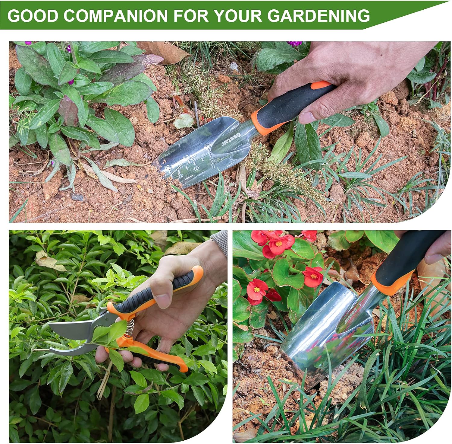 - √ 【NEW AND UPDATED DURABLE TOOLS SET】The tools are very sturdy. Pruner shear is made of heavy duty stainless steel. Trowel and transplanter are made of aluminium alloy. Perfect for all your garden needs, such as digging, loosening soil, aerating, planting, cutting branches and more.