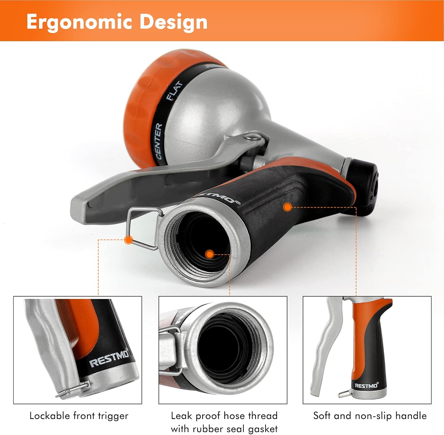 RESTMO Garden Hose Nozzle, Heavy Duty Metal Water Hose Nozzle with 7 Adjustable Spray Patterns, High Pressure Hand Sprayer with Flow Control, Best for Watering Plant & Lawn, Washing Car & Pet, Orange