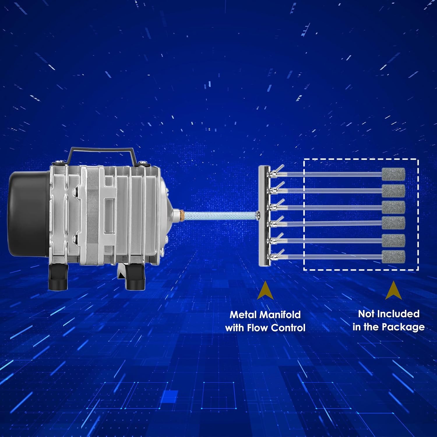 Aquarium Air Pump with Aluminum Housing, Commercial Air Pump with 6-Outlet Air Manifold, Pond Aerator Fish Tank Bubbler for Aquarium, Pond, Hydroponics (650GPH-20W)