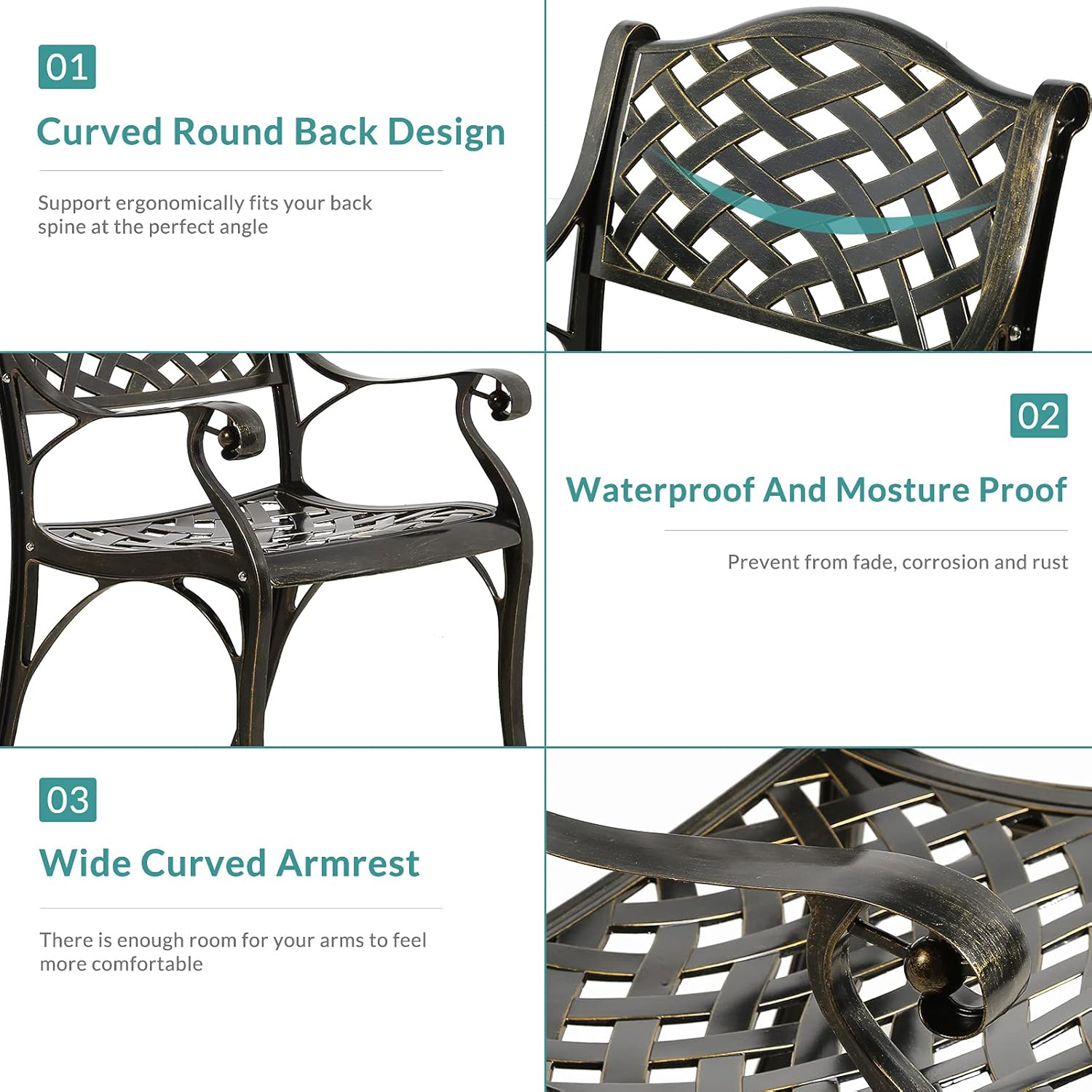 - 【Dimensions】 - Our round table is 35.4"(Dia) x 29.5"(H), and each of 2 chairs is 22.4"(L) x 22.4"(W) x 33"(H), you’ll love how this furniture set uniquely accents your space. Quickly assemble so you can enjoy it in no time, all hardware, tools and instructions required are included for easy assembly. Over this summer to show off your new, stylish, cast aluminum dining set to everyone