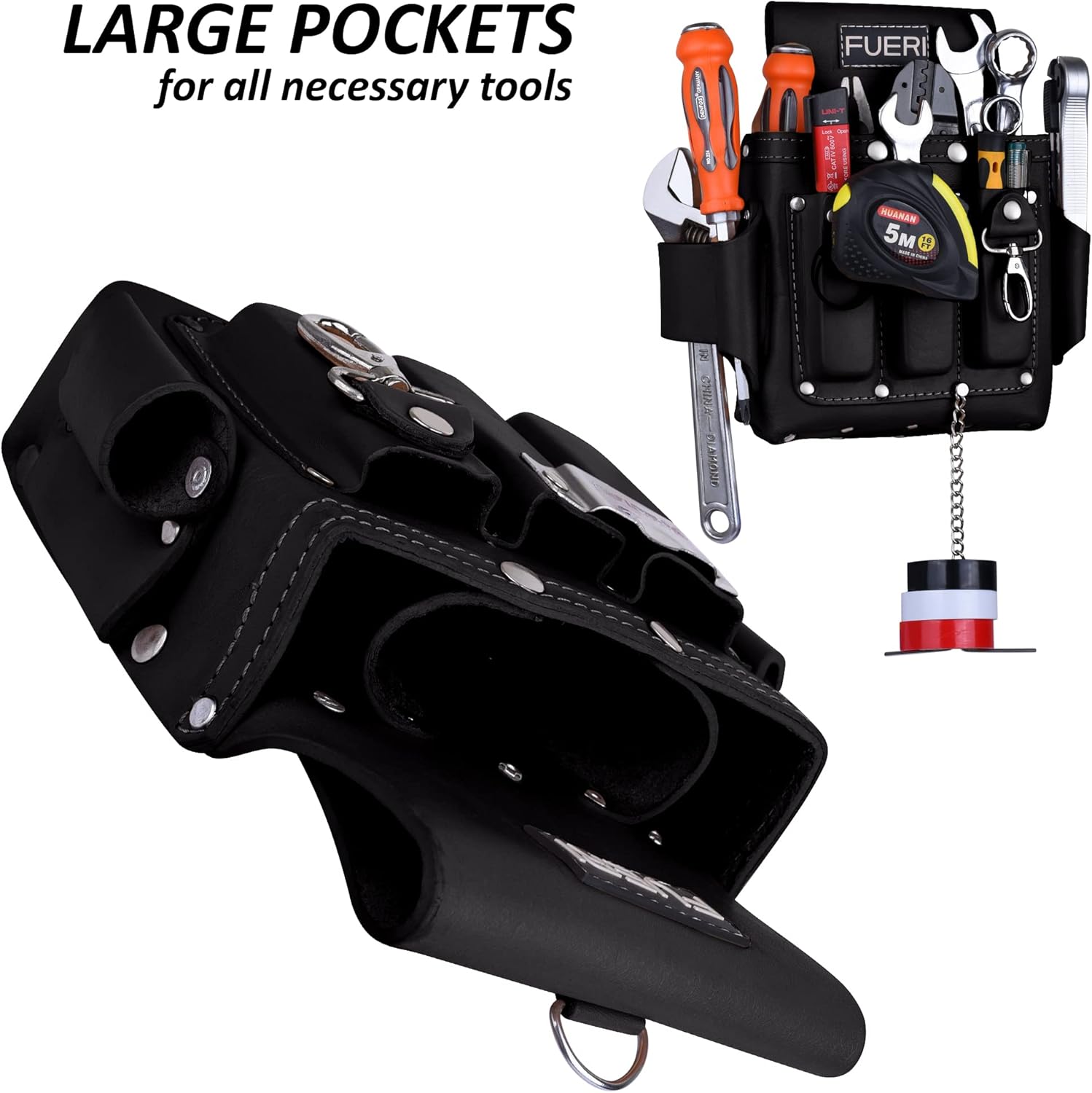 - Built to Last: FUERI has enhanced the 4-pocket electrician tool pouch, making it one of the most durable options available. Crafted from professional-grade heavy-duty leather with riveted reinforcement, this pouch withstands years of wear and tear. Designed to resist damage from sharp tools, it is ideal for carpenters, electricians, and gardeners.