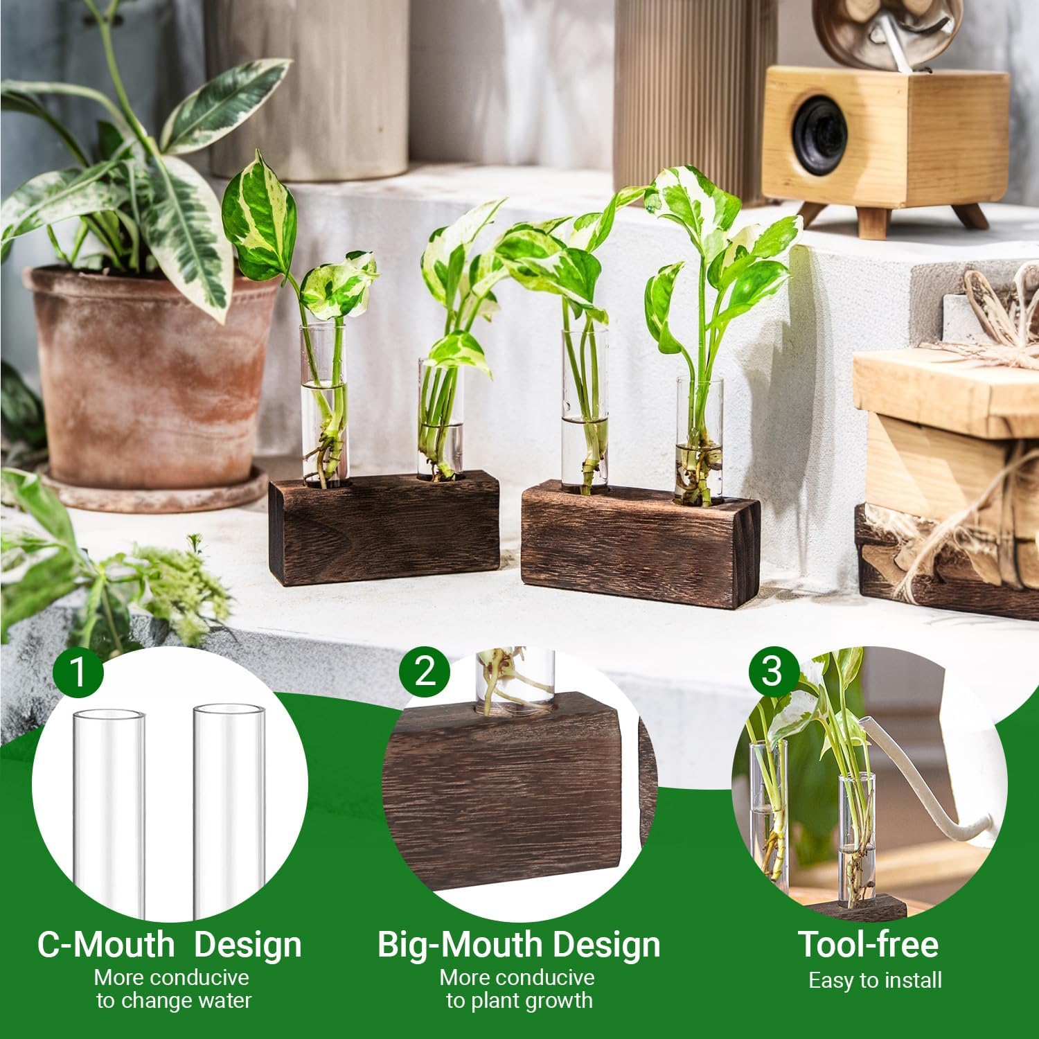 - Plant Propagation Station:Bring vintage charm and gardening functionality, making them a beautiful addition to any home. Elegantly designed propagation vases ideal for indoor plant propagation and cuttings.This propagator has feature thicker glass tubes,a sturdy wooden base,exquisite packaging to ensure they arrive in perfect condition.