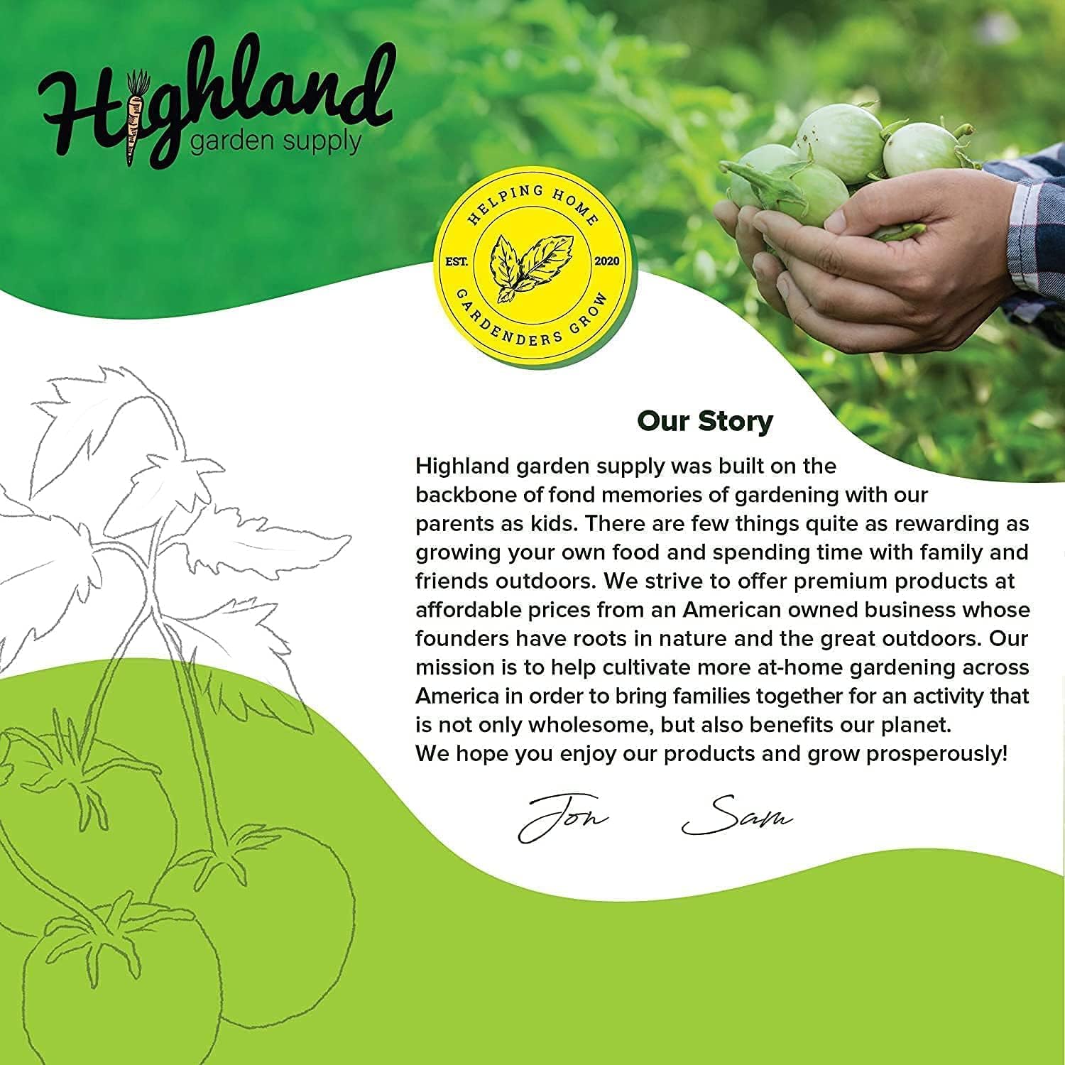 - HIGHLAND GARDEN SUPPLY: We are an American company with our roots in nature and the great outdoors. We strive to bring families & communities together to garden, and ultimately benefit our planet! We stand behind your satisfaction and our products.