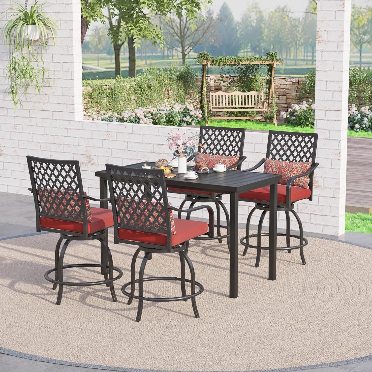Sophia & William Patio Bar Set 5 Piece Outdoor Dining Set, 4 Swivel Bar Stools Chairs with Red Cushion and 1 Rectangular Bar Height Table, All-Weather Metal Furniture Set for Garden Lawn Backyard