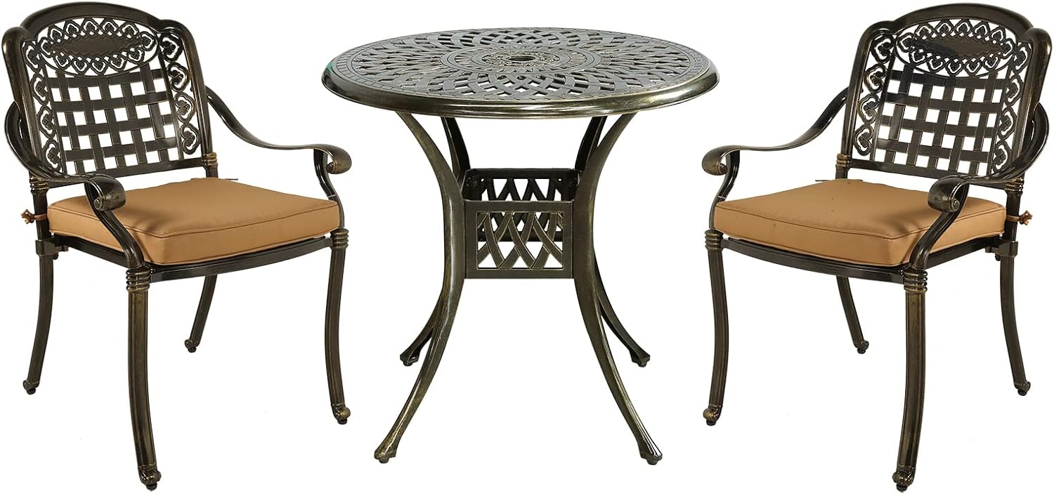 - 【Dimensions】 - Our round table is 31"(Dia) x 29.5"(H), and each of 2 chairs is 25.5"(L) x 28.3"(W) x 35"(H), you’ll love how this furniture set uniquely accents your space. Quickly assemble so you can enjoy it in no time, all hardware, tools and instructions required are included for easy assembly. Over this summer to show off your new, stylish, cast aluminum dining set to everyone