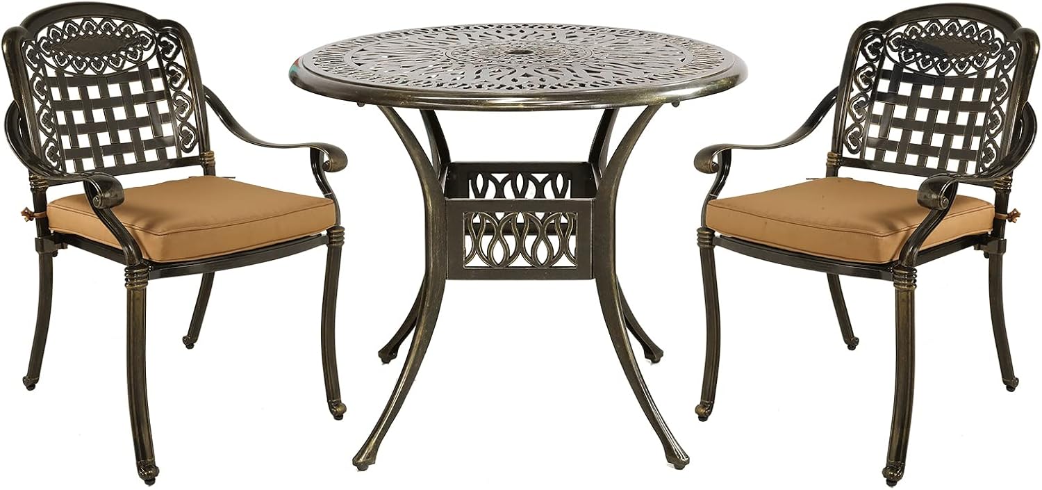 - 【Dimensions】 - Our round table is 35.4"(Dia) x 29.5"(H), and each of 2 chairs is 25.5"(L) x 28.3"(W) x 35"(H), you’ll love how this furniture set uniquely accents your space. Quickly assemble so you can enjoy it in no time, all hardware, tools and instructions required are included for easy assembly. Over this summer to show off your new, stylish, cast aluminum dining set to everyone