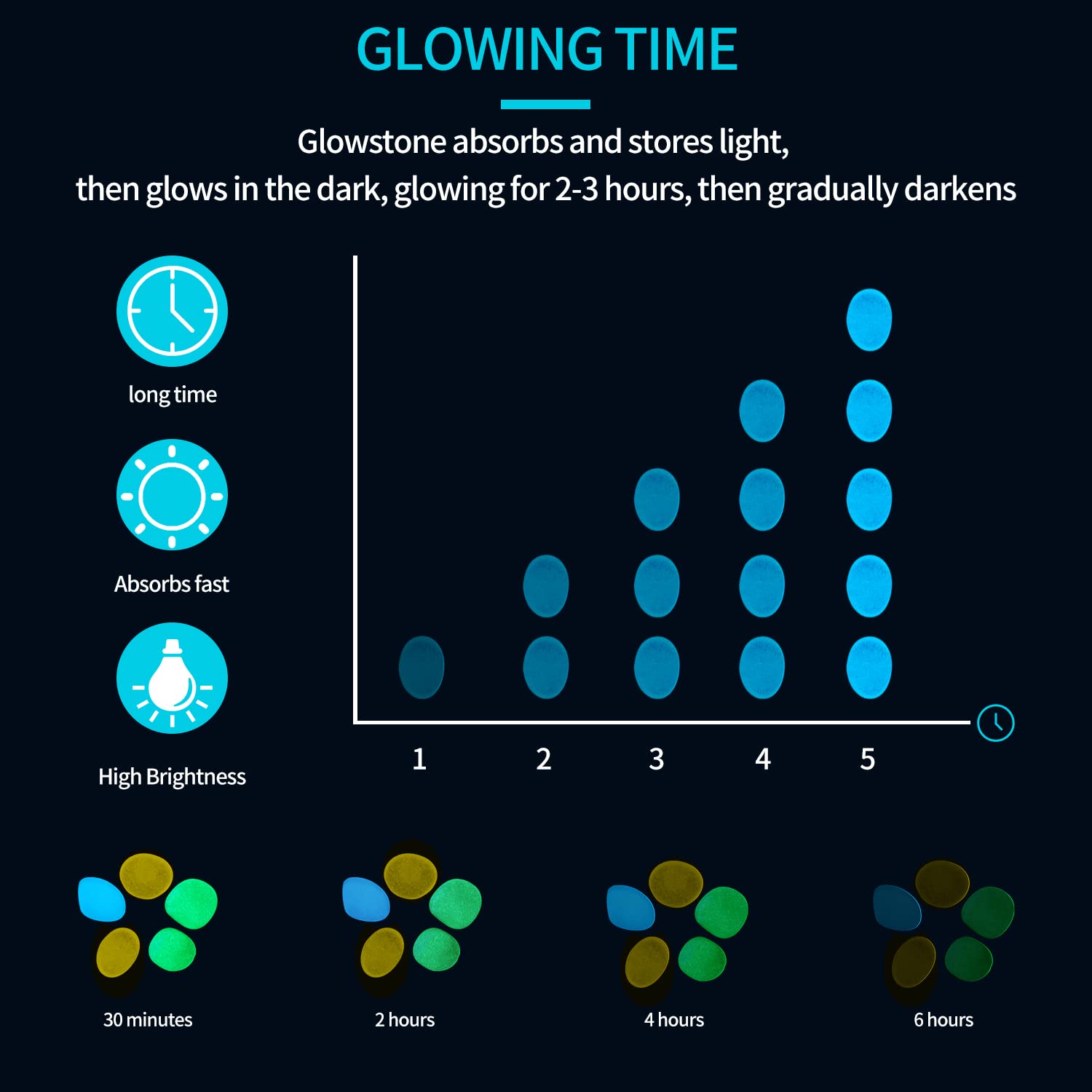 - HOW IT WORKS - The glow stone will absorbs and stores light, then they give off light in the darkness, with several hours of bright glow and then gradually dim away. The process will repeat for many years.