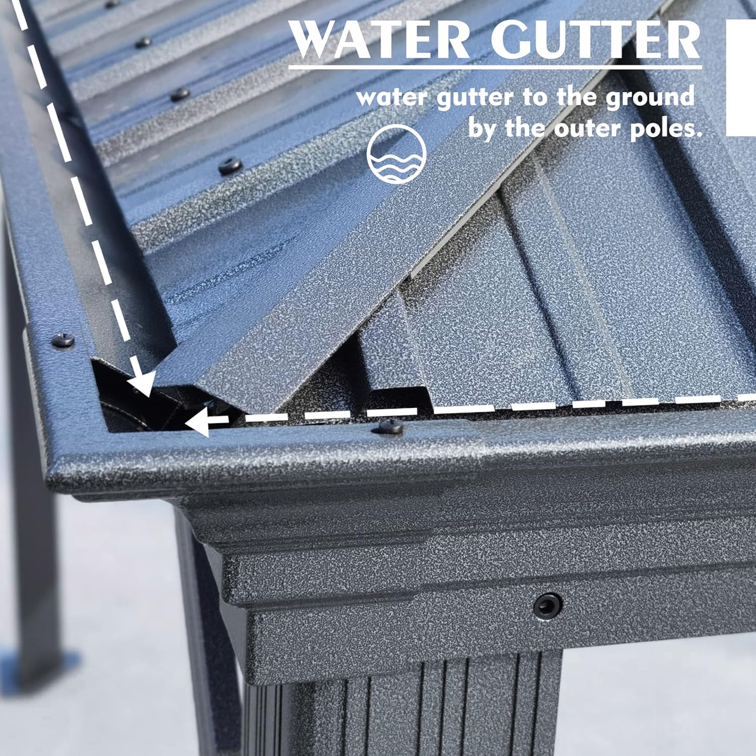 - âś…Metal Canopy/Roof and Gutter Design - The metal canopy of this gazebo ensures longevity and durability. Its roof, made of sheet metal, boasts a robust 29-gauge thickness, which is thicker than most gazebos on the market. its water gutter system ensures that rainwater is efficiently directed away from the edges of the frame and poles.