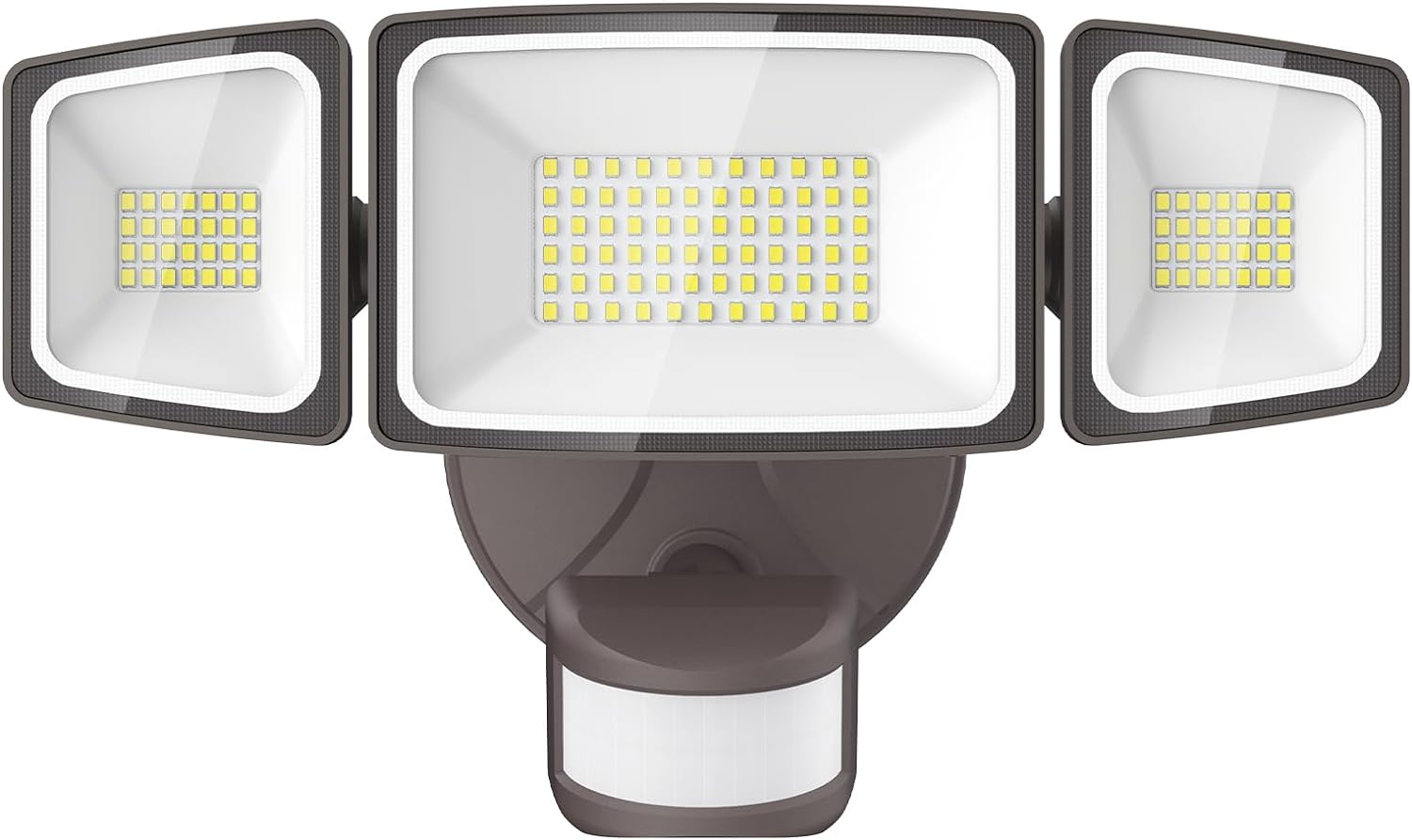 Onforu 65W LED Security Lights Motion Sensor Light Outdoor, 6500LM, 6500K, IP65 Waterproof, Flood Light Outdoor Motion Detector with Adjustable 3 Head, Hardwired Wall Light for Entryway, Yard (Brown)