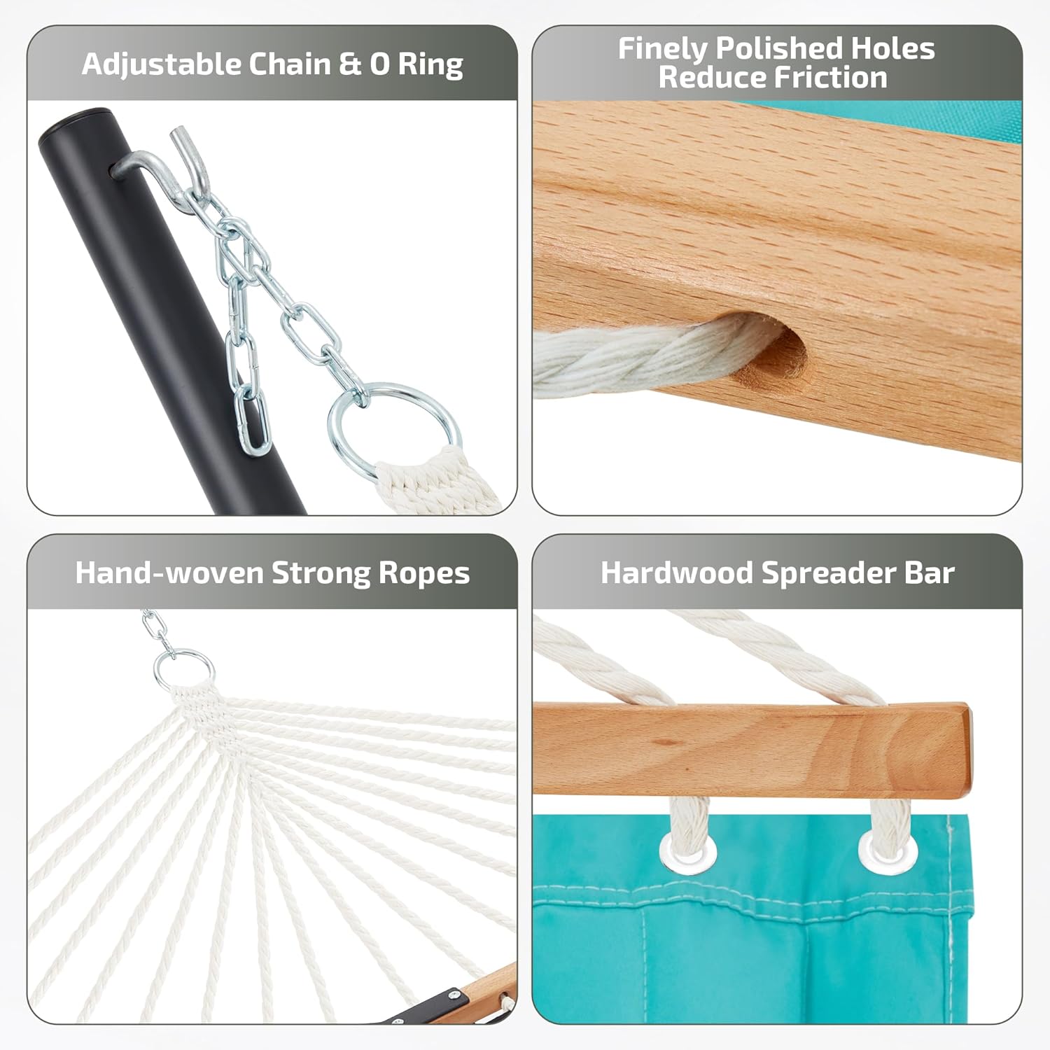 - ăCurved Spreader BarăThe angle of the curved bars make the center of gravity more stable when using. The countersunk spreader bar holes can reduce the friction between rope and wood which make the hammock stands the test of time.
