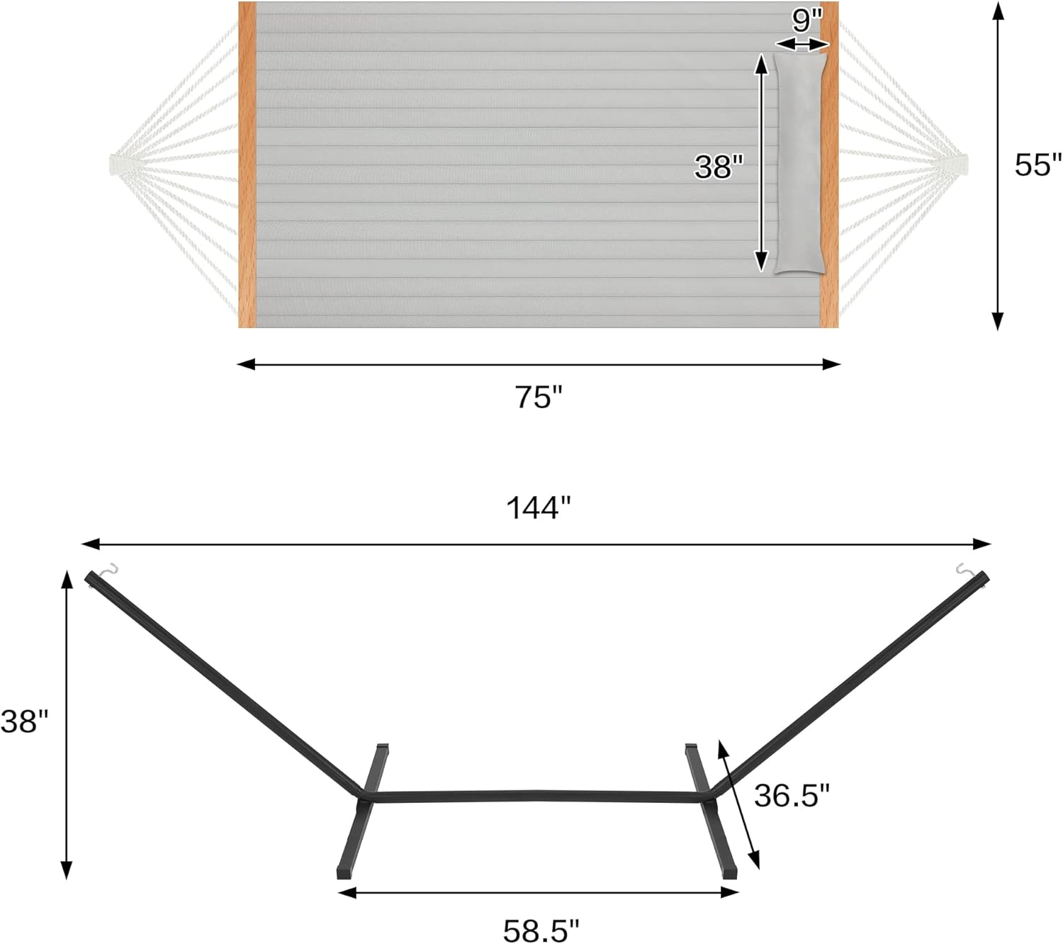 - ăExtra Large Size & Extended SpaceăWith full size 144 inches(L) *55 inches(W) *38 inches(H) this hammock is big enough for two adults. Equipped with added detachable book bag & cup bag this hammock offers more storage space for your leisure time.