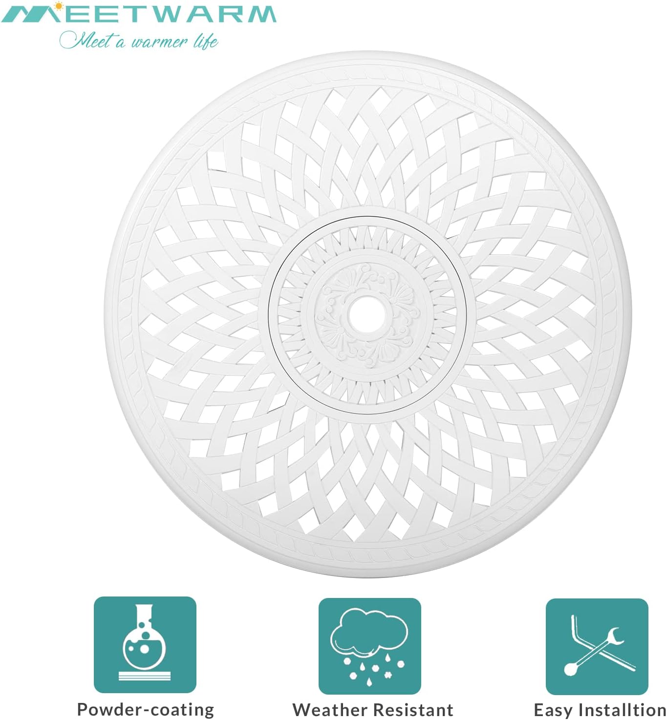 - 【Weather Resistant】 - At MEETWARM, we bring you the best outdoor furniture available. Our table and chairs are made of sturdy and durable cast aluminum with rust-resistant powder coated surface for years of outside use. If you use this set by the pool, its all-weather quality helps prevent water damage caused by wet swimsuits and splashing