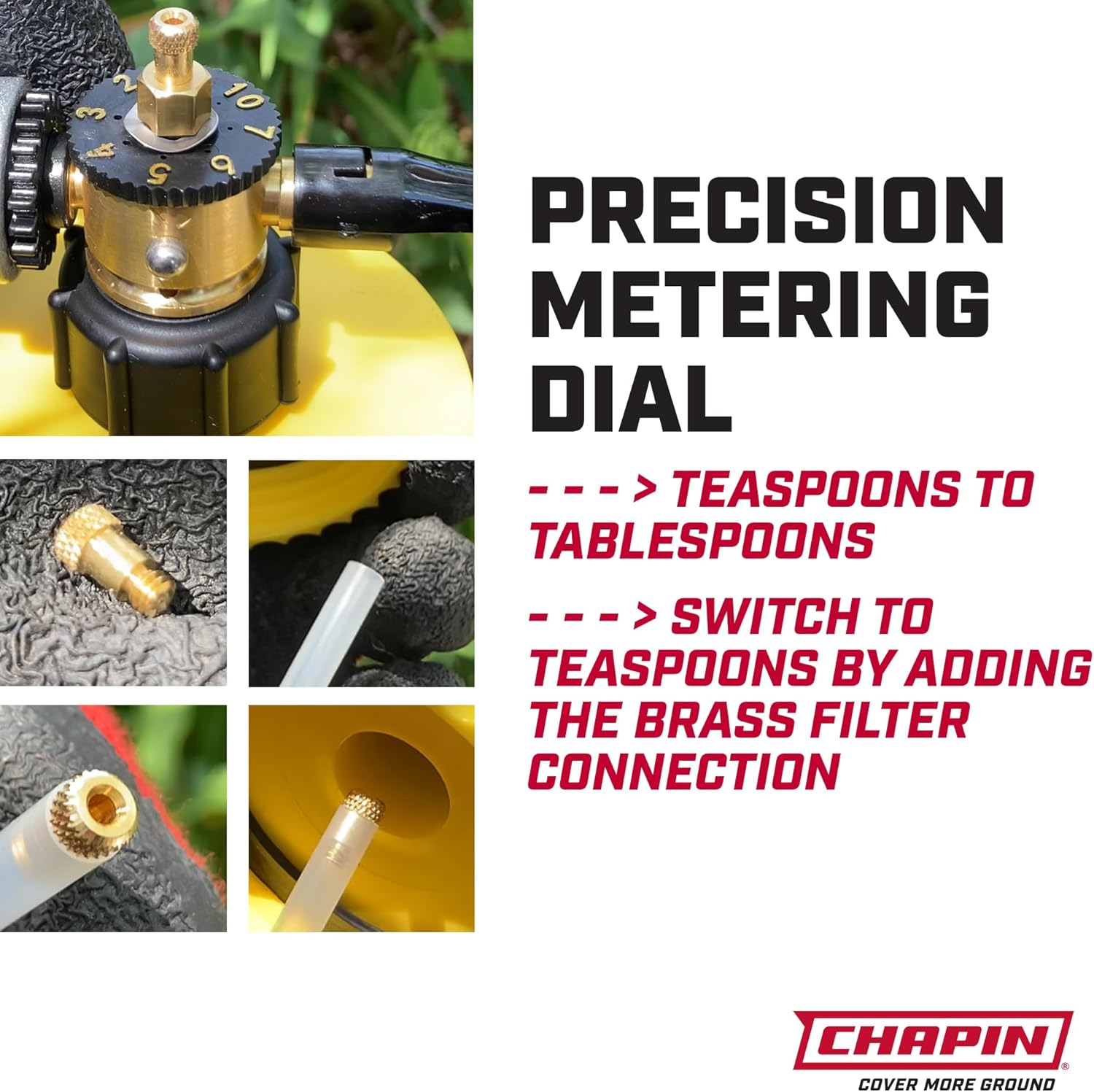 - BACKFLOW PREVENTION AND METERING DIAL: built-in anti-siphon valve prevents chemicals from flowing back into your hose and water supply; durable mixing head with 16 options on the spray dial to precisely spray the correct amount of chemical
